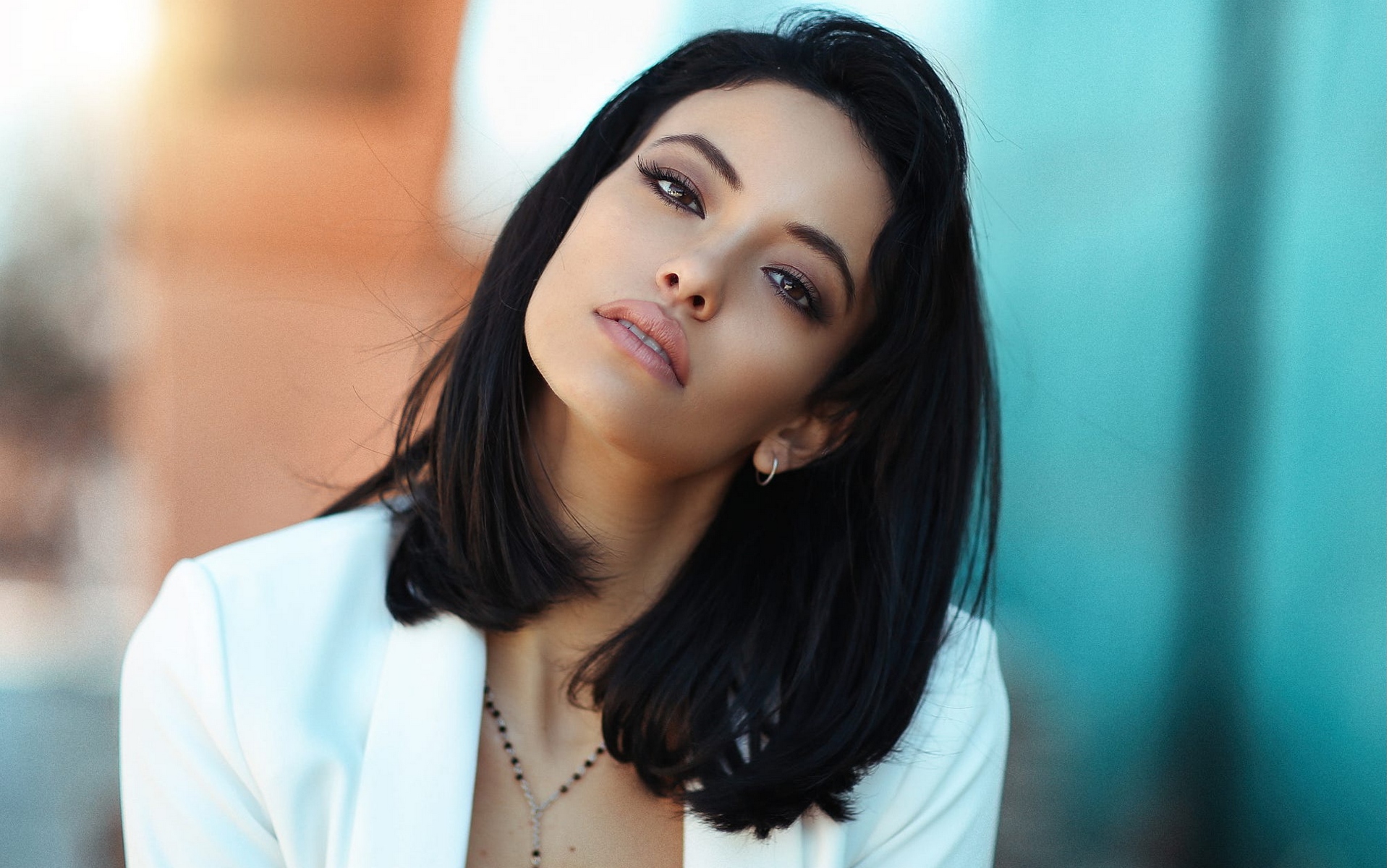 Description: A woman with a necklace and a white jacket on posing for a picture with a blue wall behind her.