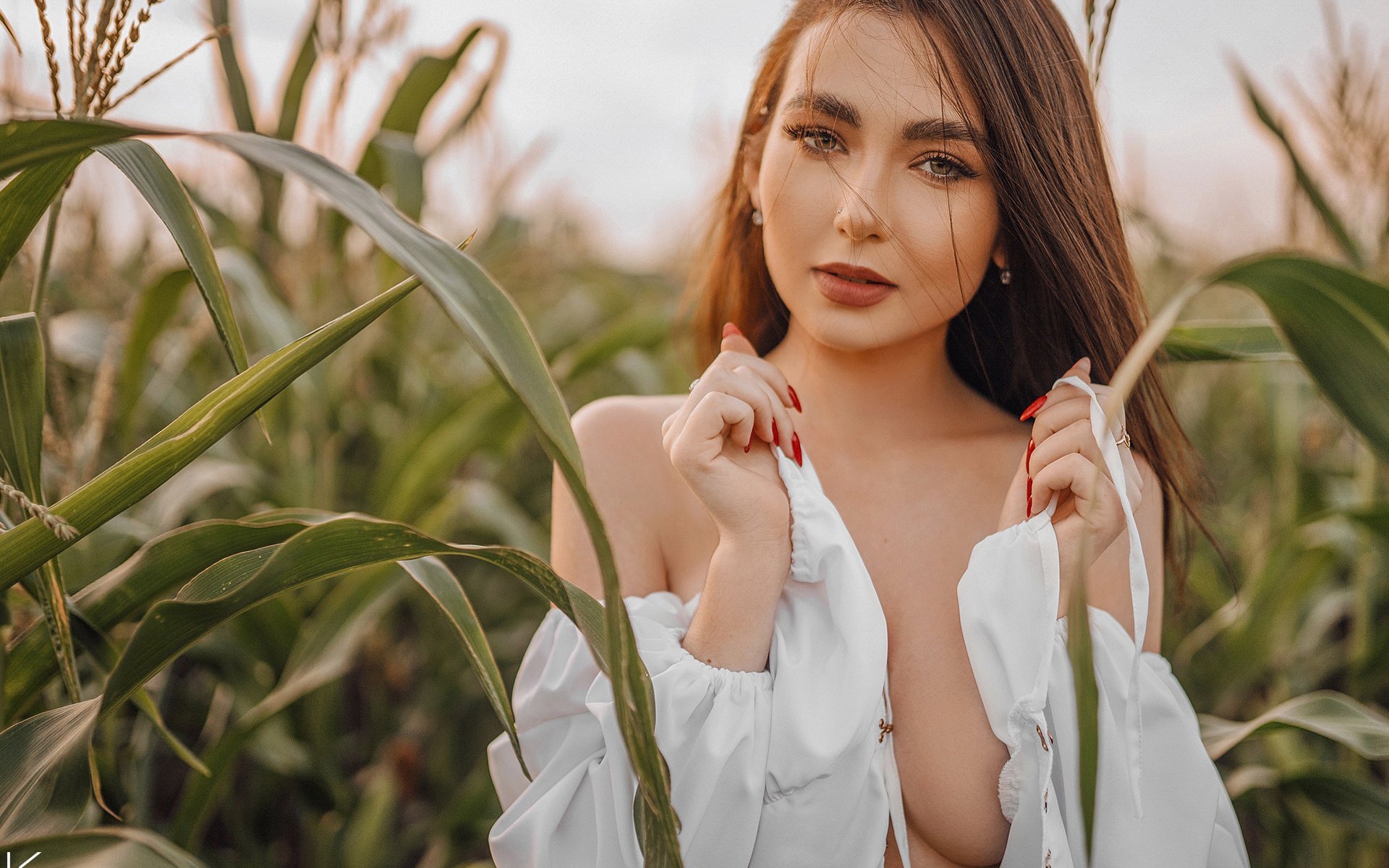 Description: A woman in a white shirt standing in a field of corn with her hands on her breasts and looking at the camera.