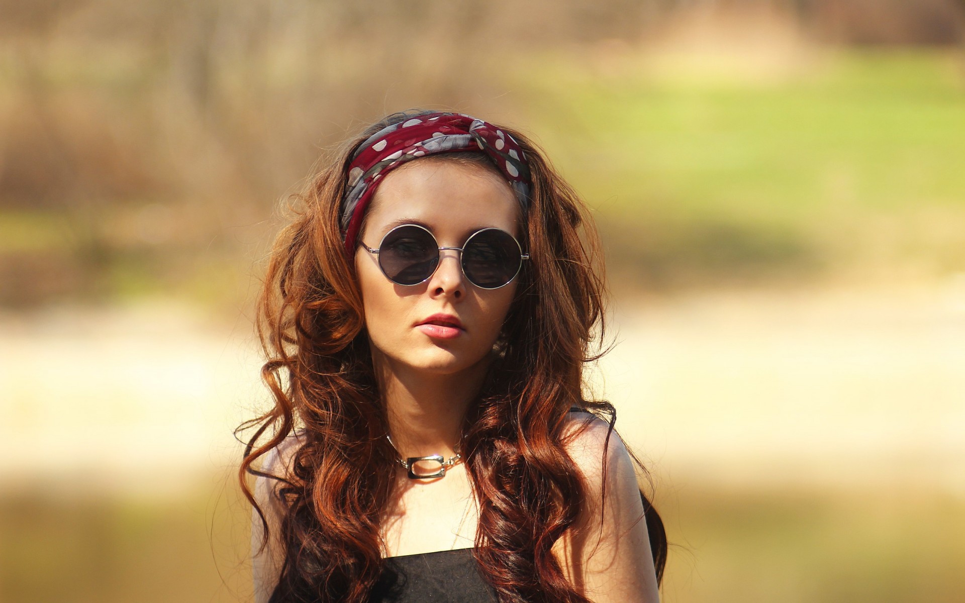 Description: A woman with sunglasses and a bandana on her head is standing near a lake and looking at the camera.