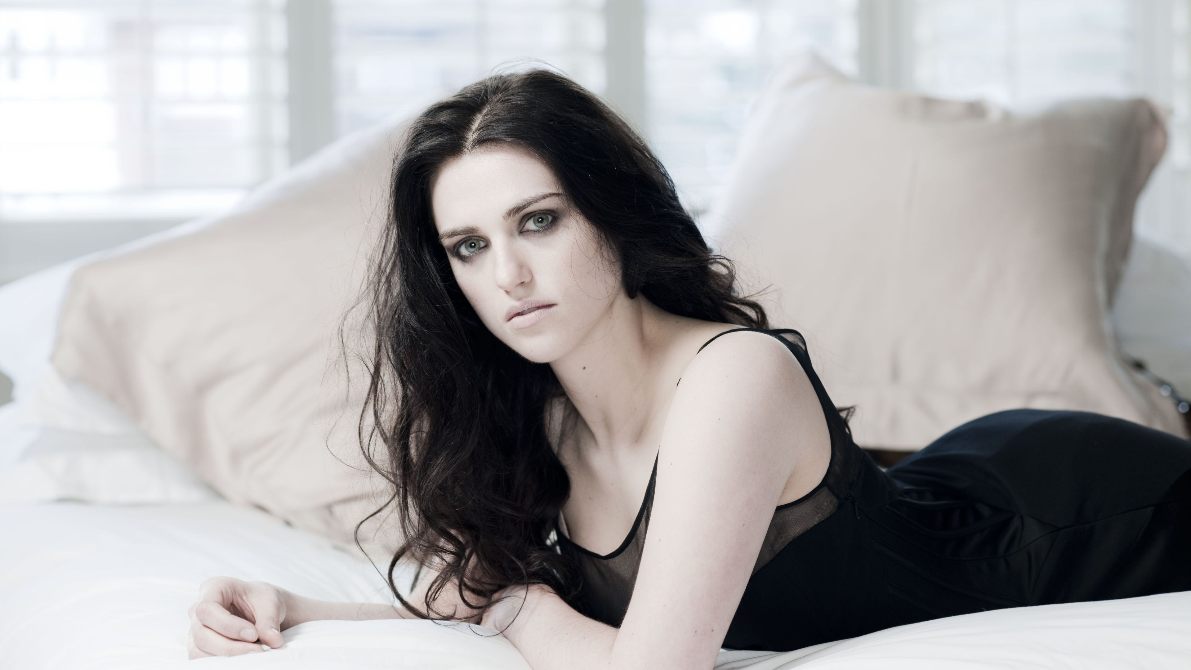 Description: A woman laying on a bed with pillows and pillows behind her.