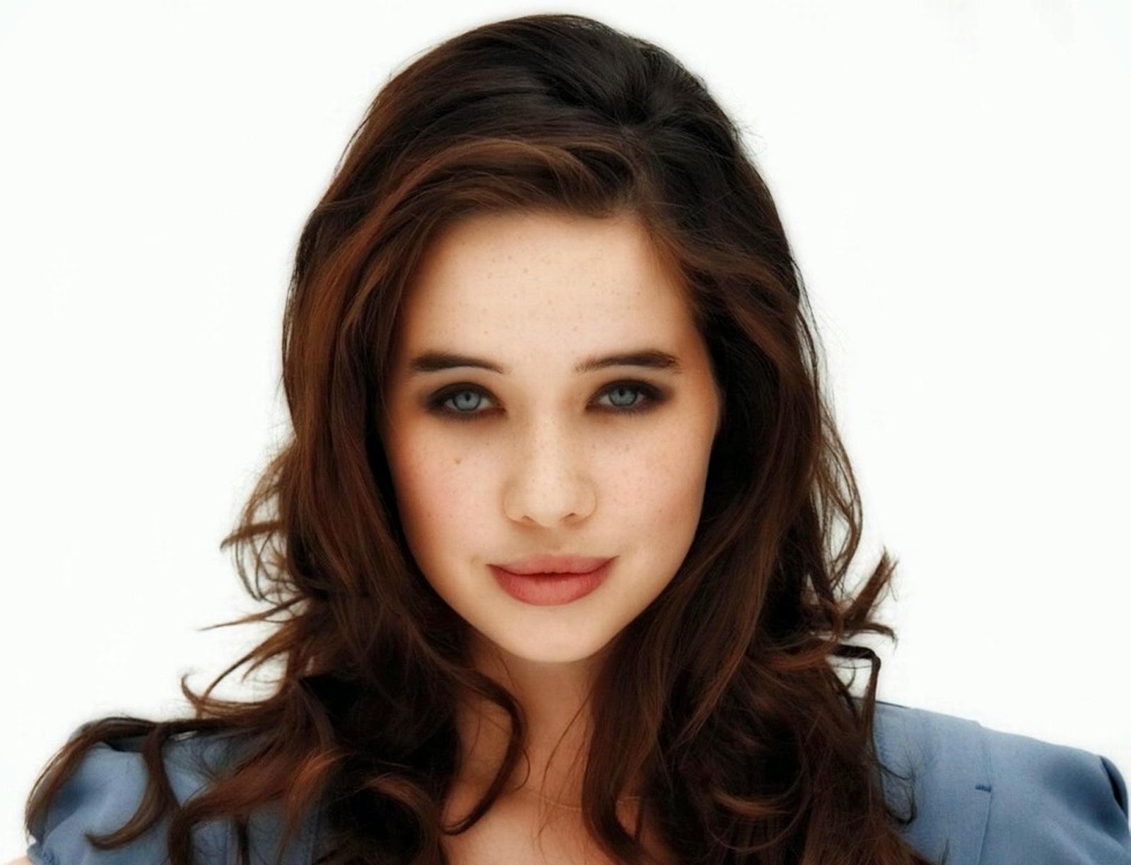 Description: A woman with long hair and blue eyes posing for a picture with her hands on her hips and her eyes closed.