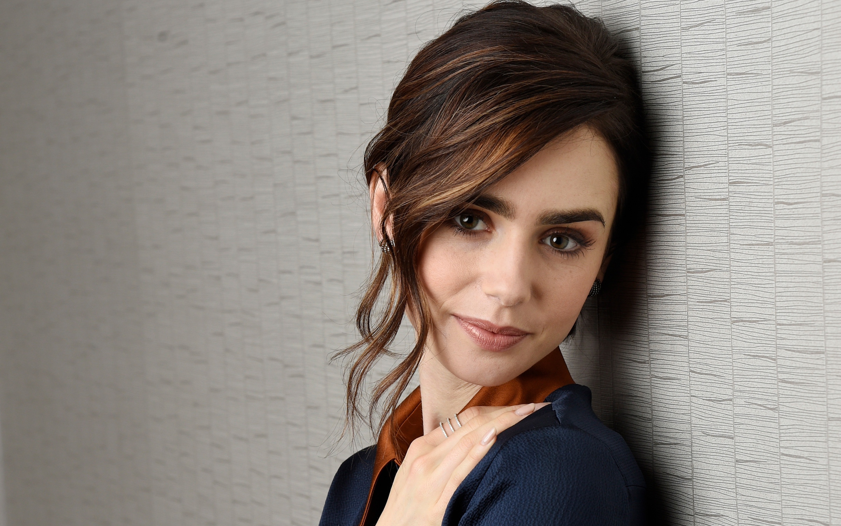 Description: A woman leaning against a wall with her hand on her neck and a tie on her necktie.