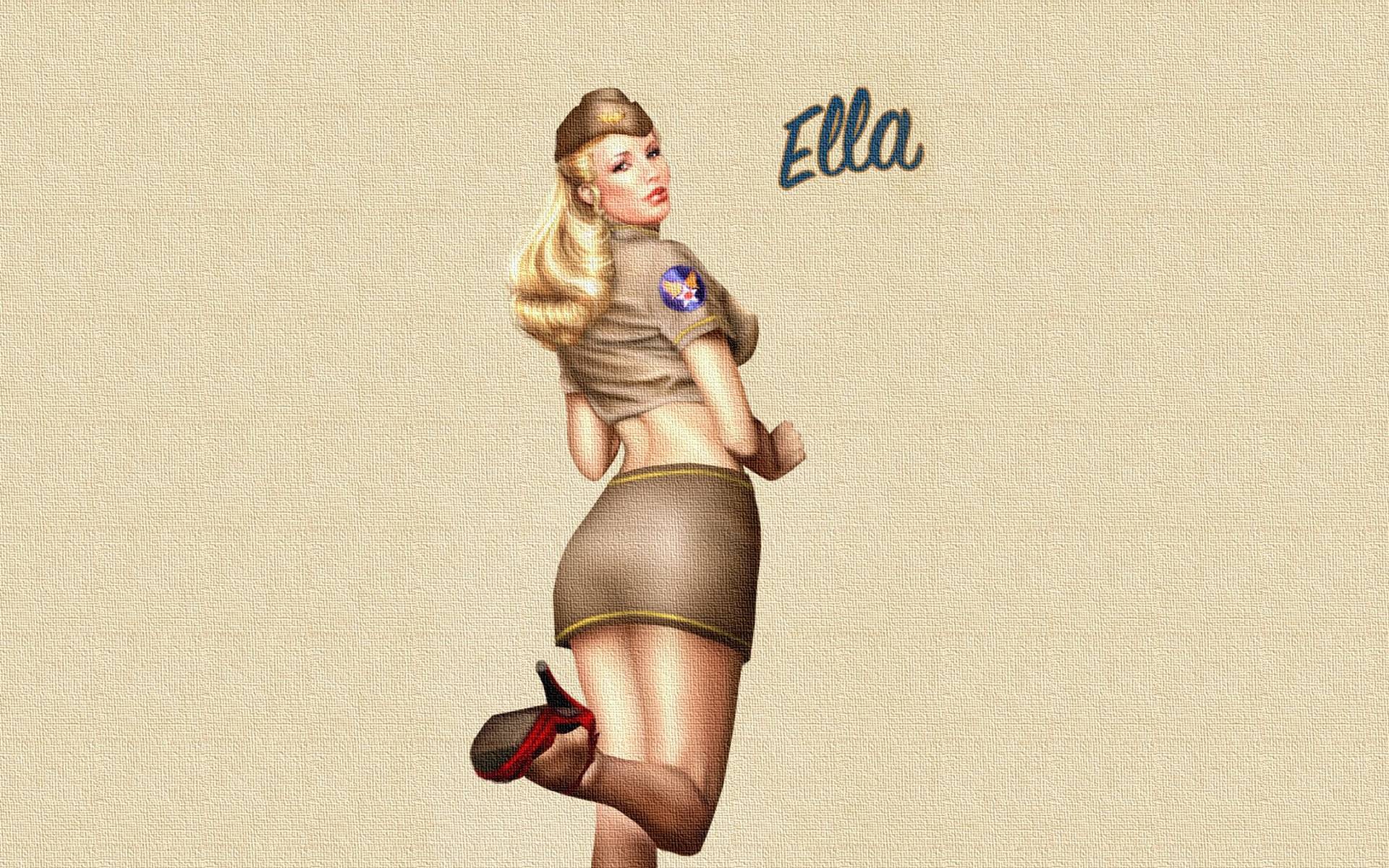 Description: A woman in a skirt and boots is standing in the air with her legs crossed and her hand on her hip.