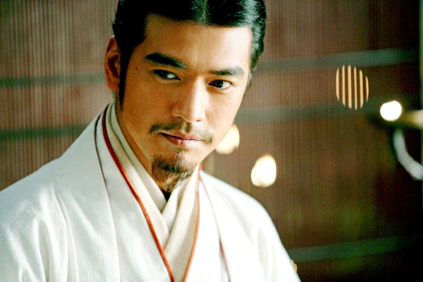 Description: A man in a white shirt and a red and white tie and a wooden door and a light fixture.