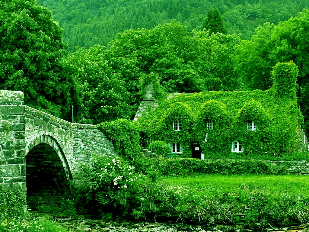 Description: A bridge with a house covered in ivy next to a river and trees in the background with a mountain in the distance.