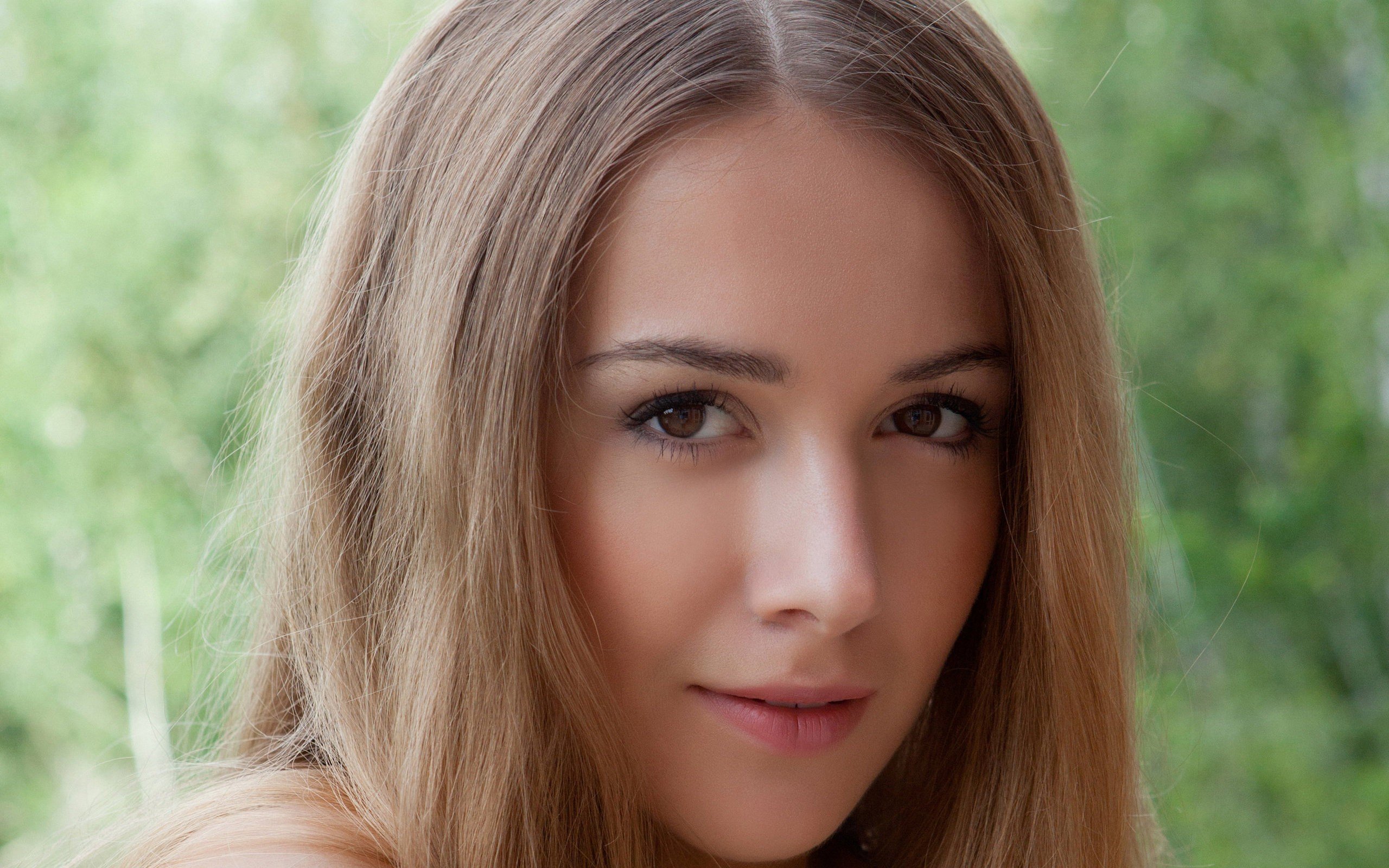 Description: A woman with long blonde hair and a green background is posing for a picture with her hair in a half up style.