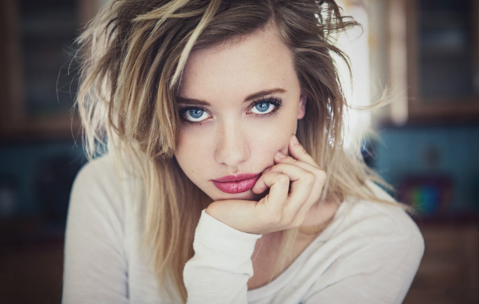 Description: A woman with blue eyes and a white shirt is posing for a picture with her hand on her chin.
