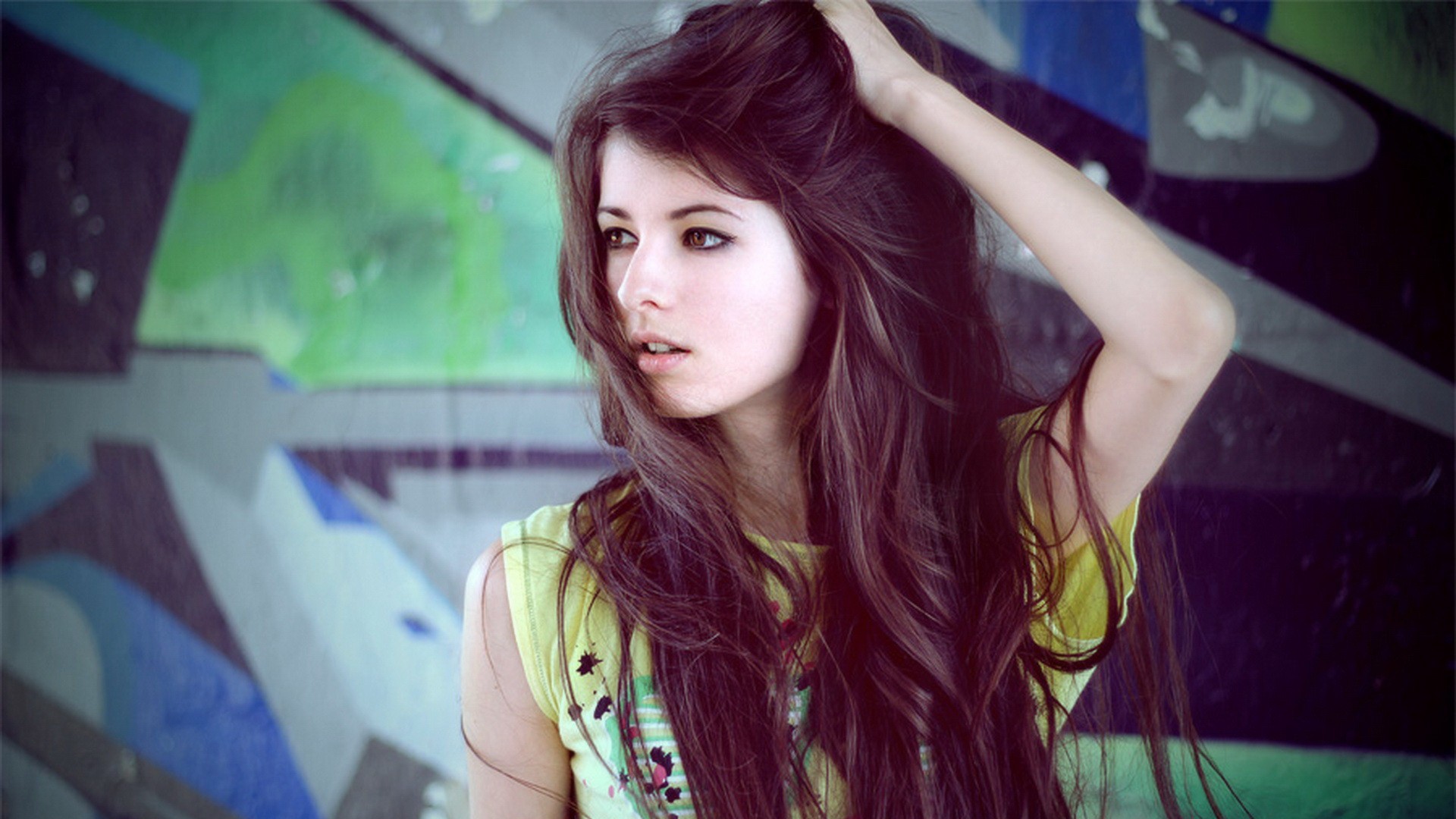Description: A woman with long hair standing in front of a wall with graffiti on it and holding her hair in her hand.