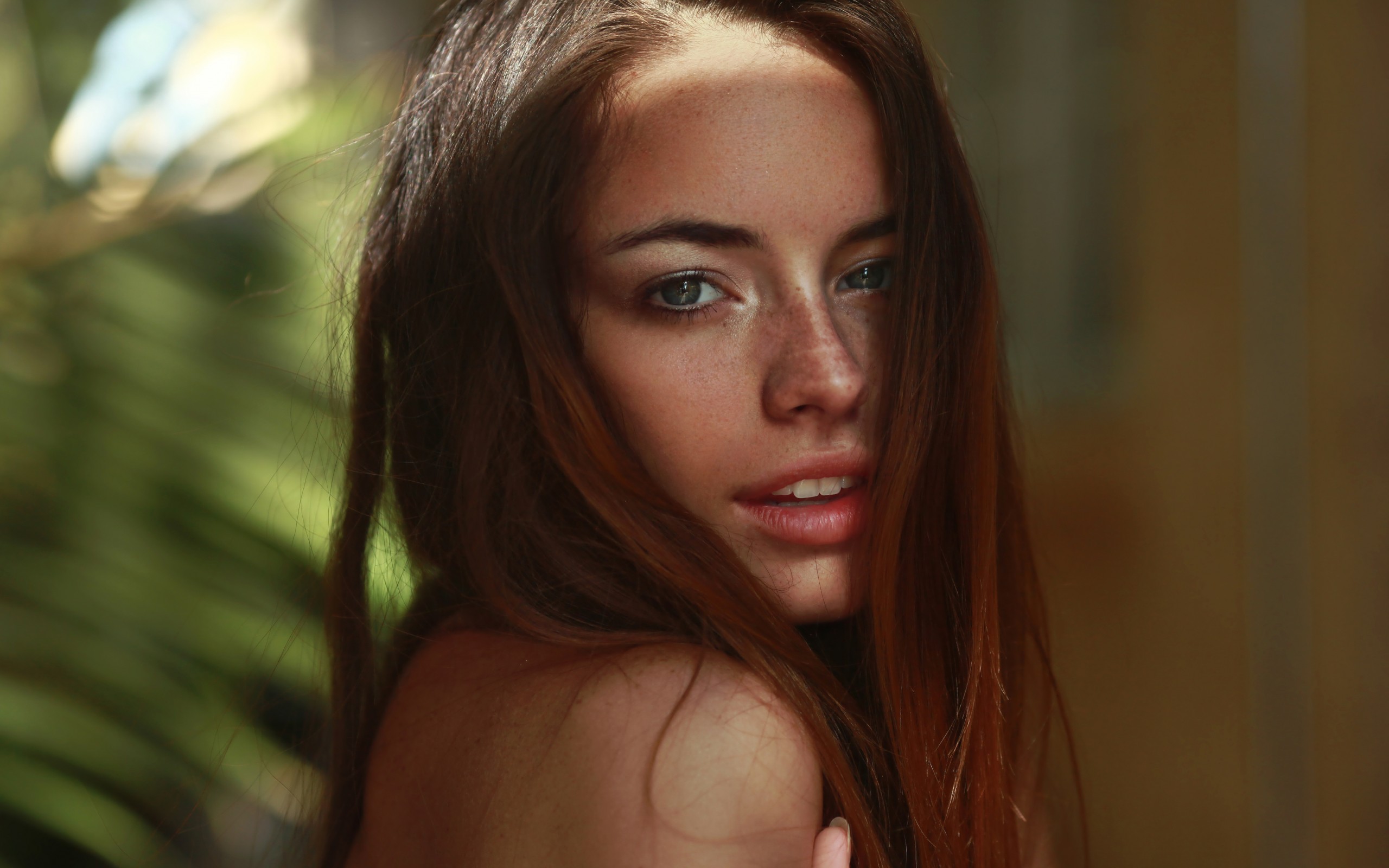 Description: A woman with long hair is posing for a picture with a green plant in the background and a blurry background.