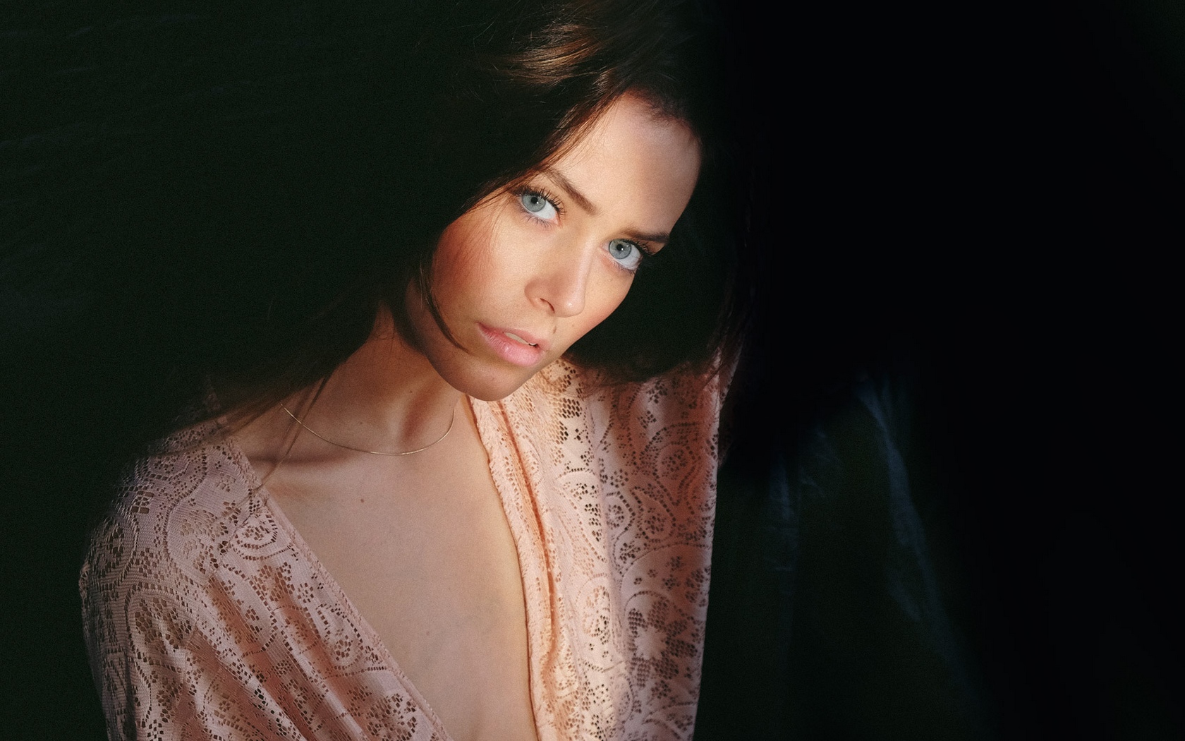 Description: A woman in a pink dress posing for a picture with a black background and a black background behind her.