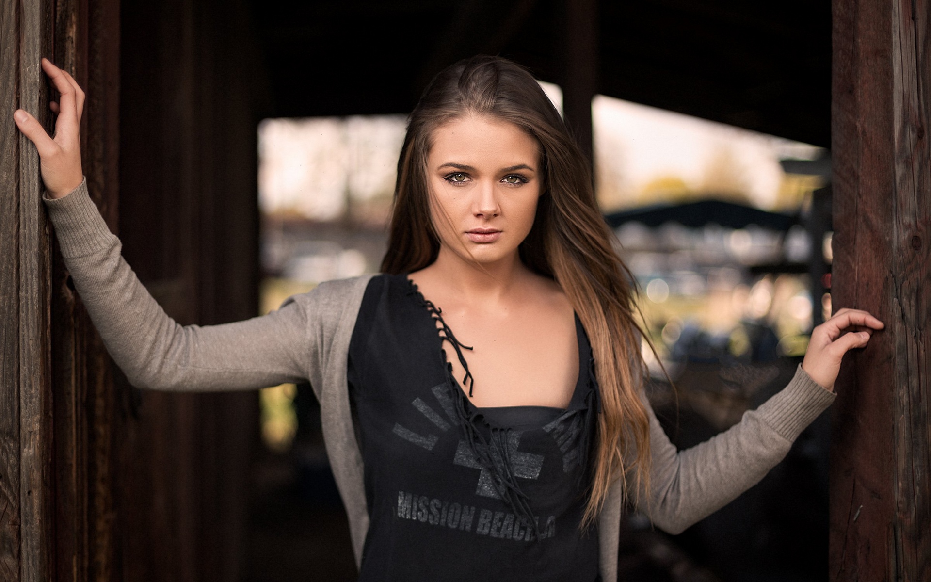 Description: A woman with long hair standing in a doorway with her hands on her hips and looking at the camera.