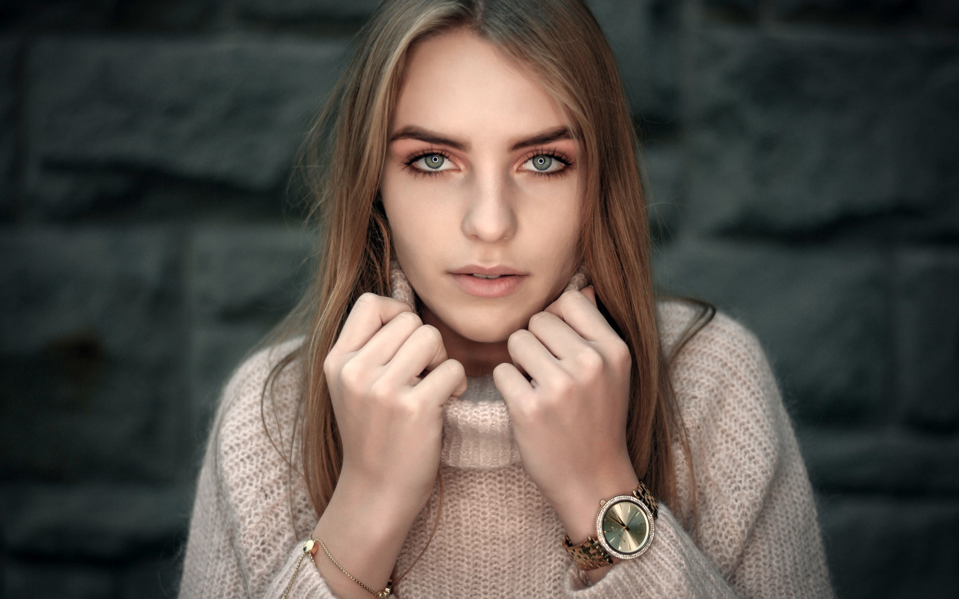 Description: A woman with long hair and a sweater on posing for a picture with her hands on her face and hands on her chest.