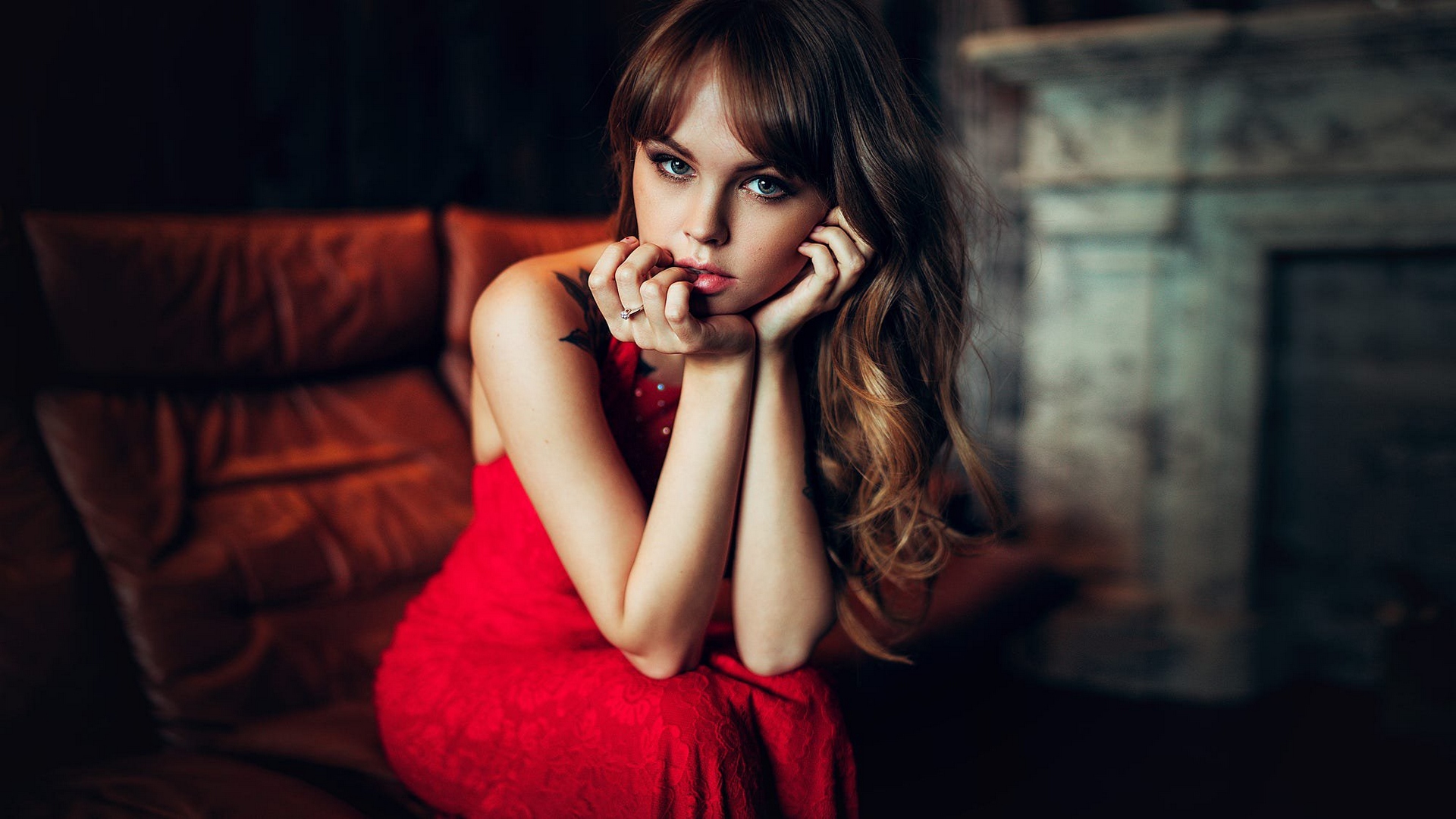 Description: A woman in a red dress sitting on a couch with her hands on her face and her hand on her chin.