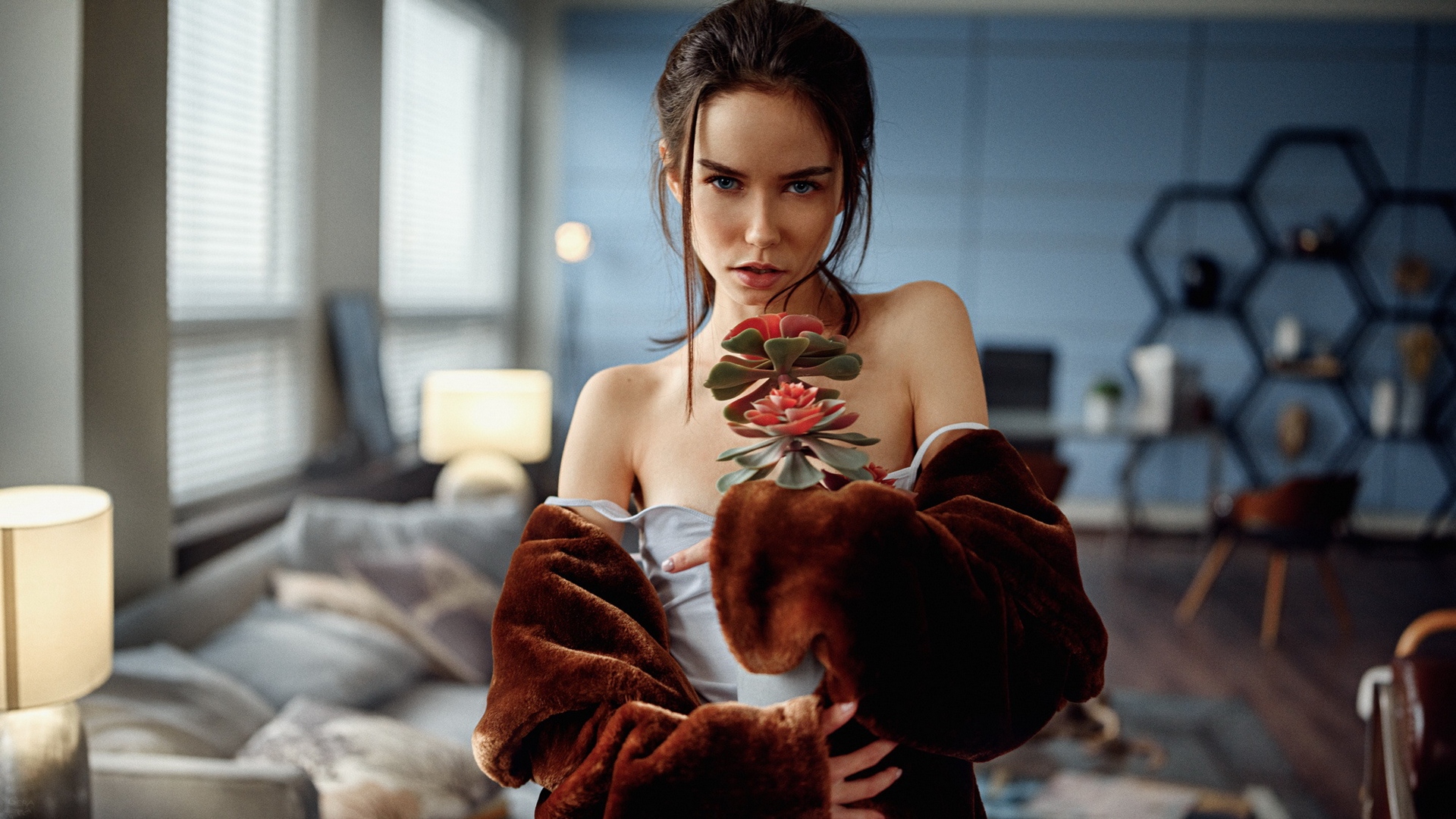 Description: A woman holding a teddy bear in a room with a bed and a lamp on the side of the room.