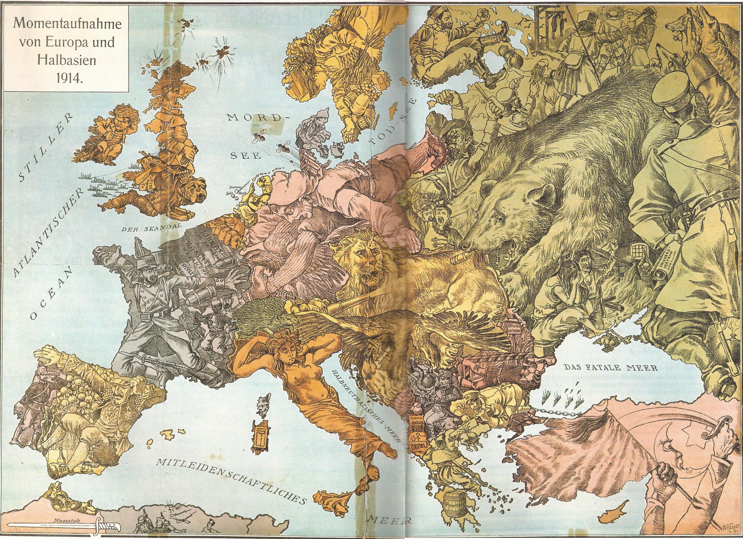 Description: A map of europe with a lot of animals on it's sides and a lot of land on the other side.