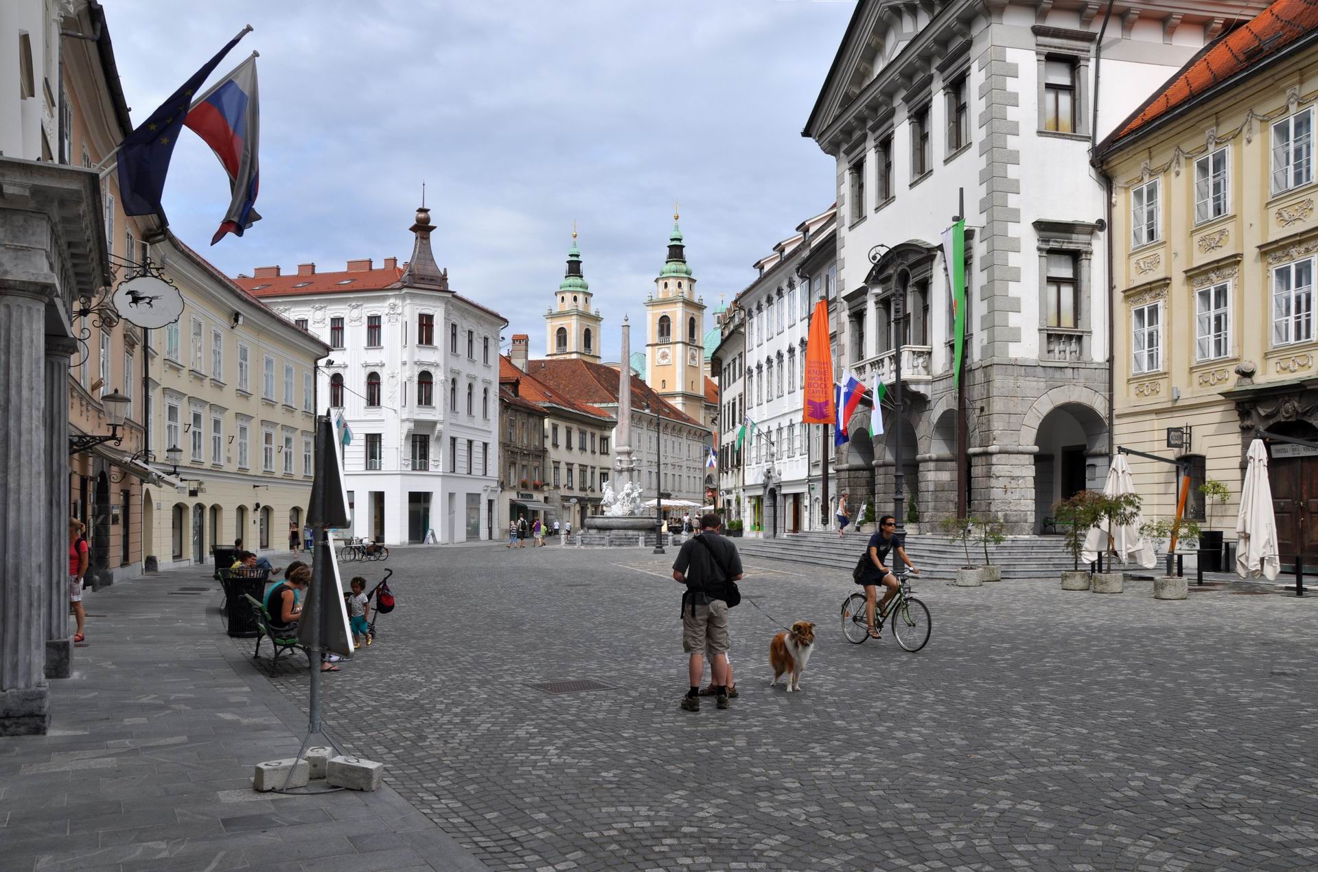 Description: A man walking a dog down a cobblestone street in a european city with tall buildings and a clock tower.