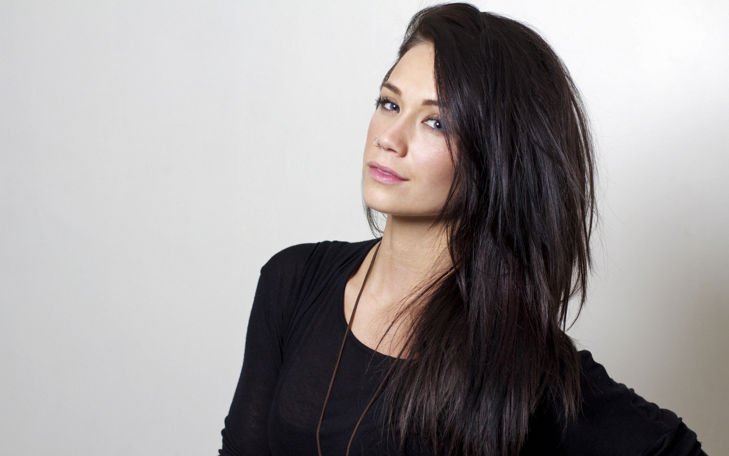 Description: A woman with long hair is posing for a picture with her hand on her hip and looking off to the side.