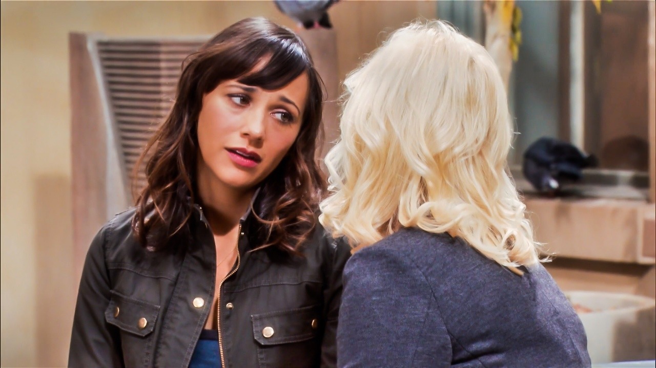 Description: A woman with a black jacket talking to another woman in a room with a sink and a mirror in it.