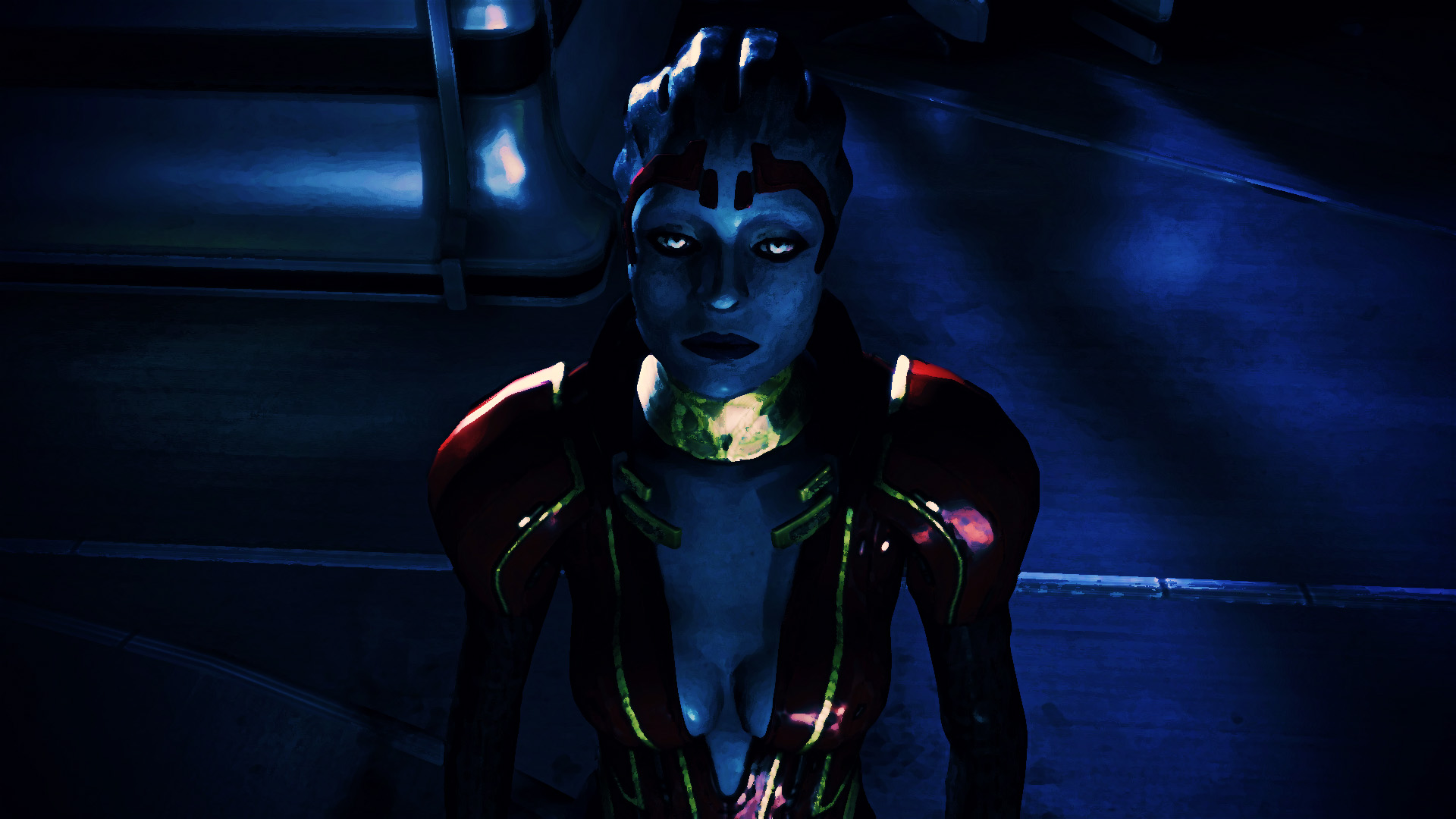 Description: A woman in a costume standing in a dark room with a blue light on her face and a black background.