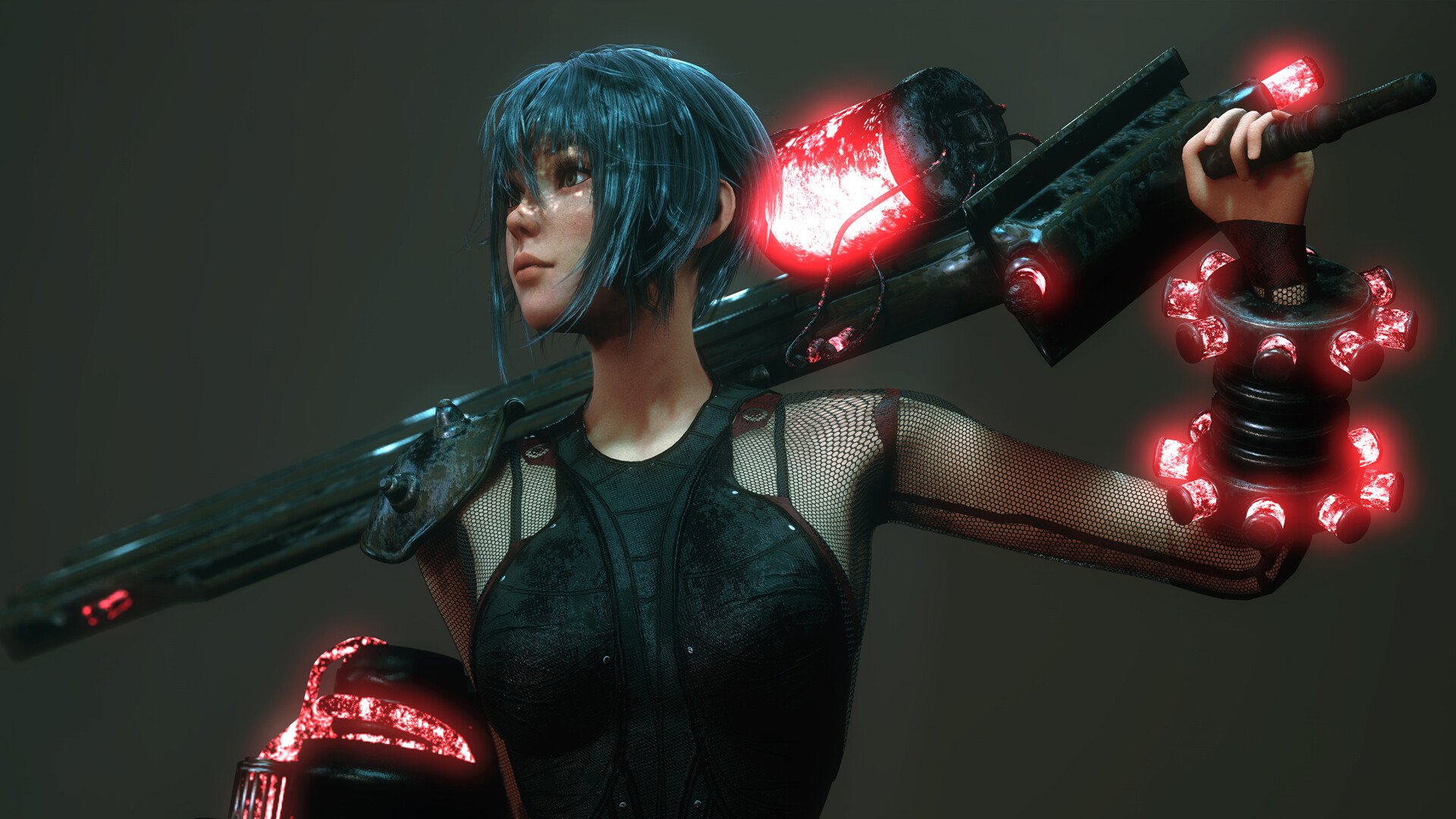 Description: A woman holding a gun and a light up light up gun in her hand.
