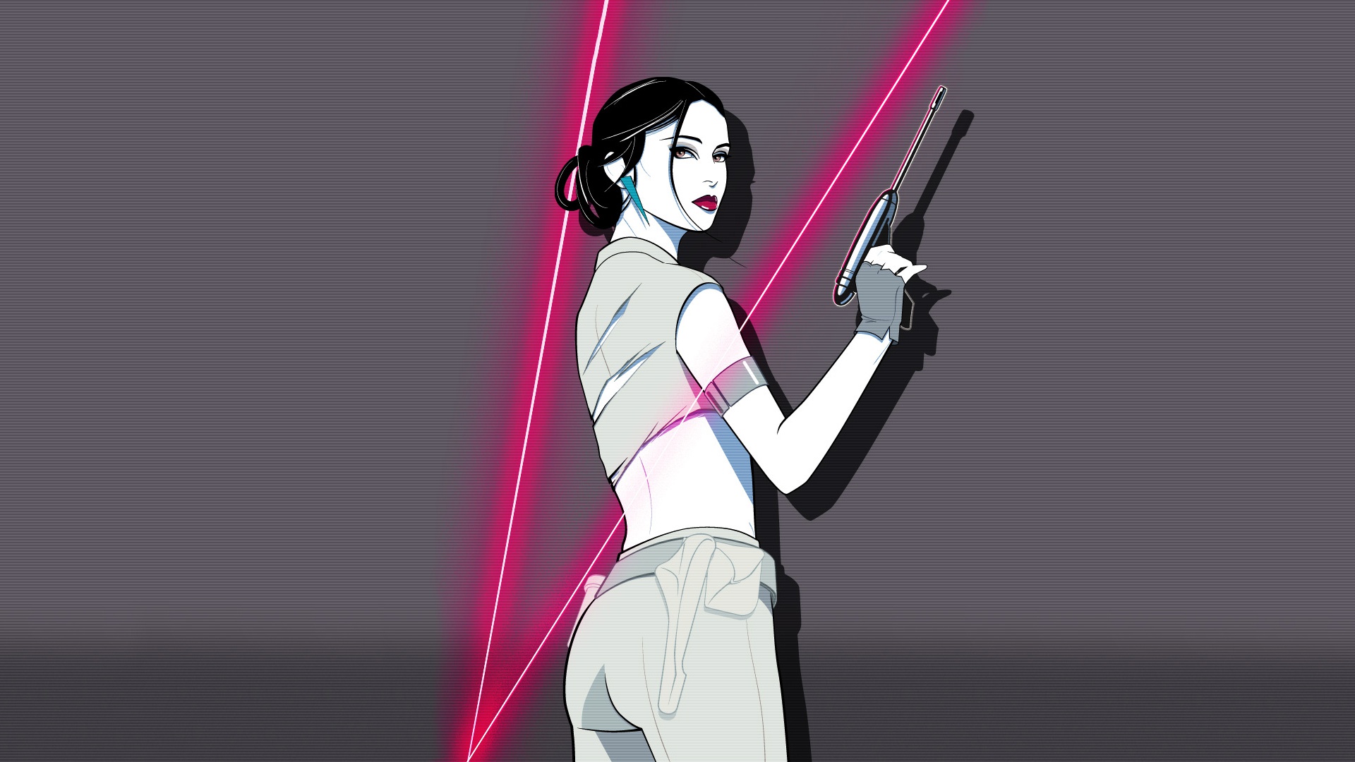 Description: A woman holding a gun and a cell phone in her hand with a laser light behind her and a pink light behind her.