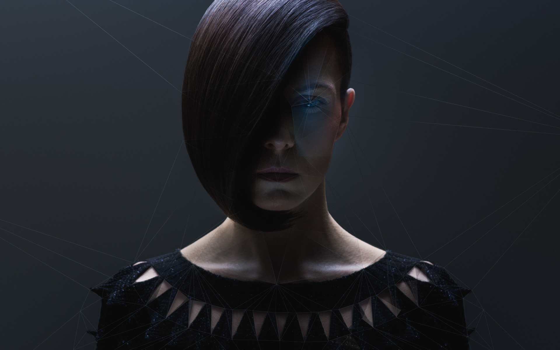 Description: A woman with a dark hair and blue eyes is shown in a dark background with lines in the background.