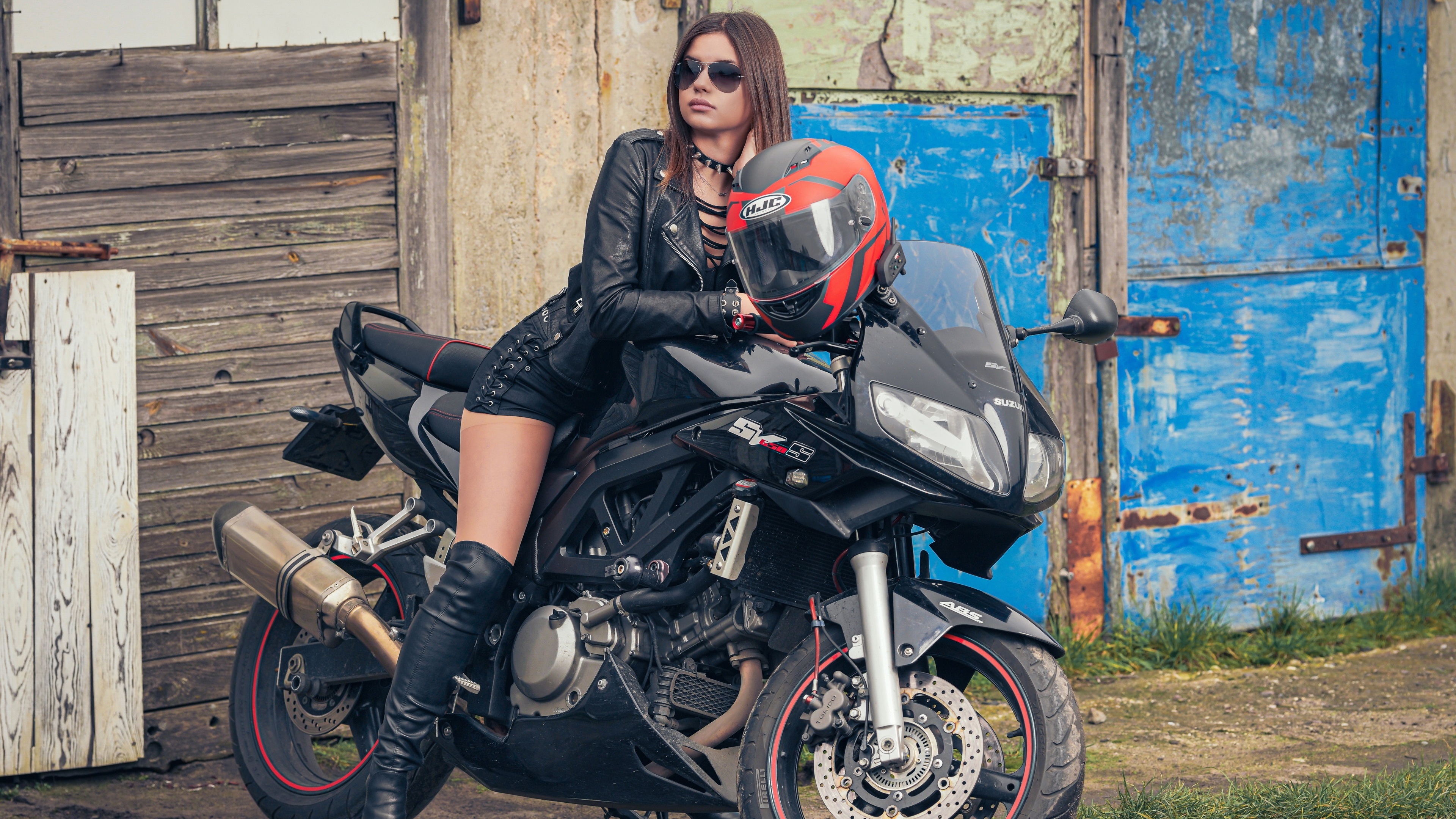 Description: A woman in black leather outfit sitting on a motorcycle with a red helmet on it's back tire.