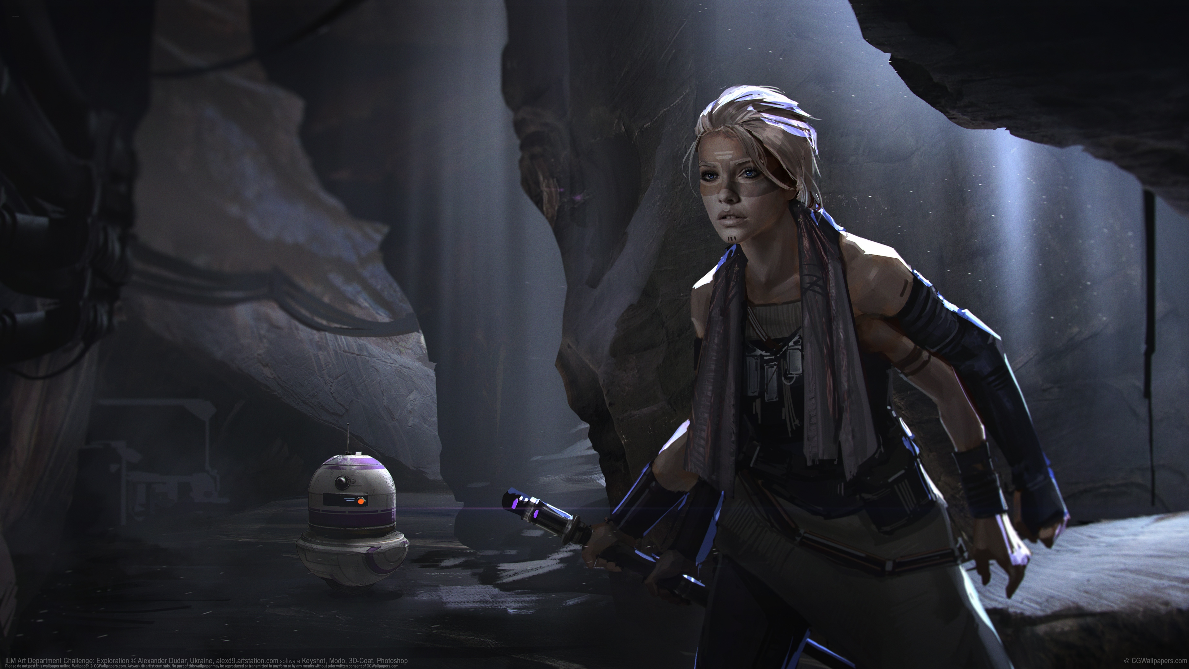 Description: A woman in a sci - fi fi outfit standing in a cave with a robot in the background and a light shining on her face.