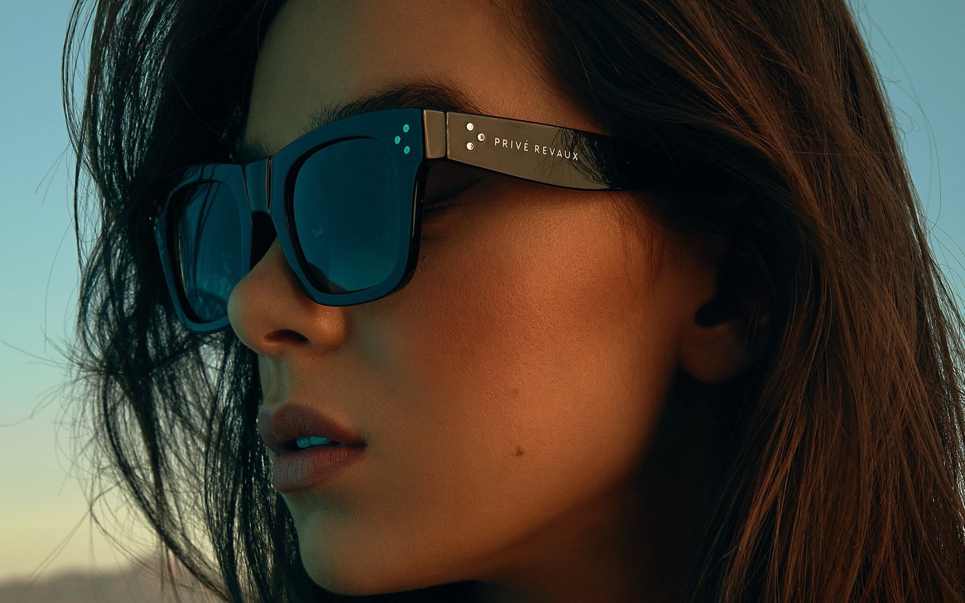 Description: A woman wearing sunglasses with a metal bar on the side of her face and a sky background behind her.