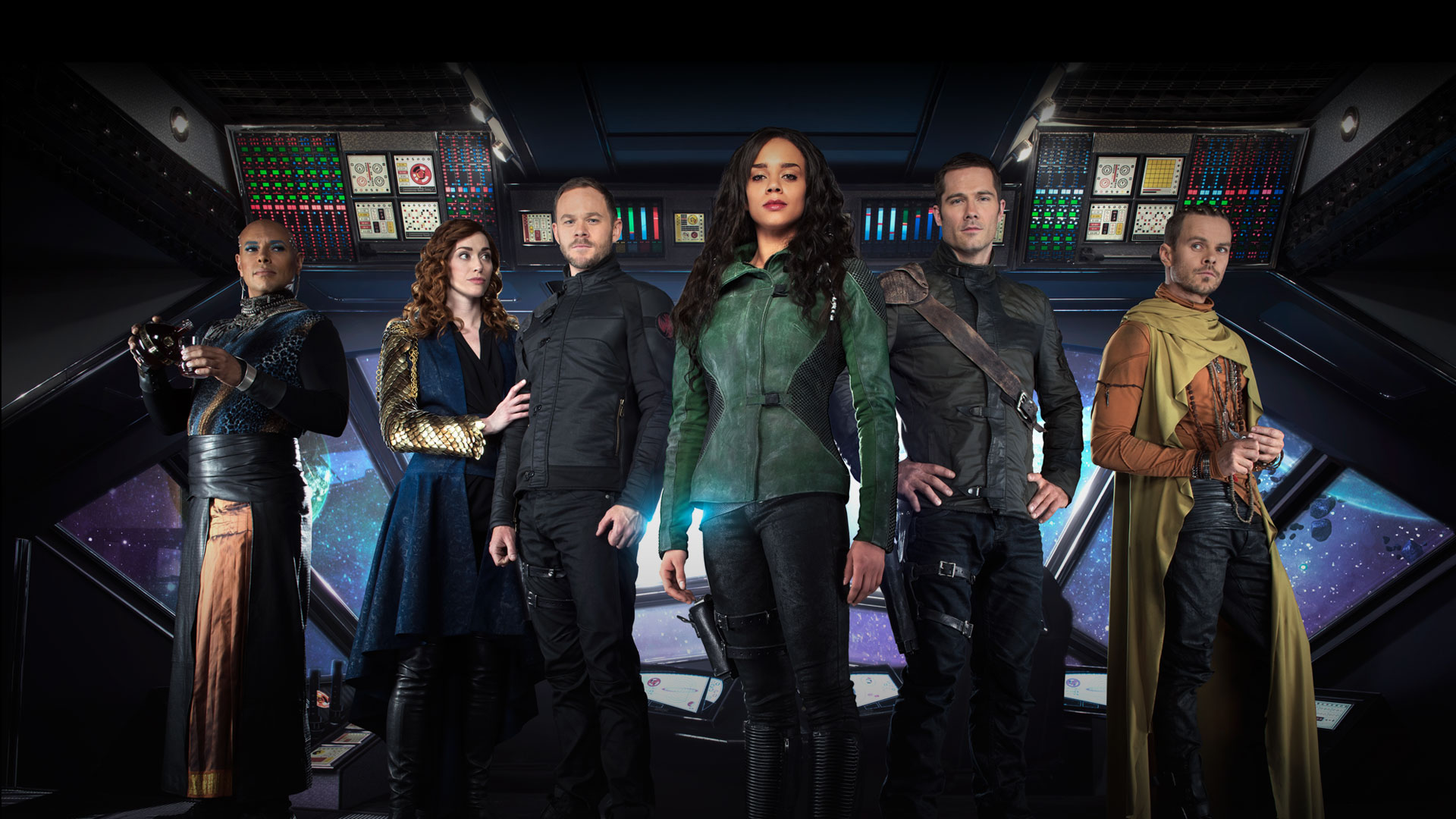 Description: A group of people standing in front of a space station with a spaceship in the background and a woman in the foreground.