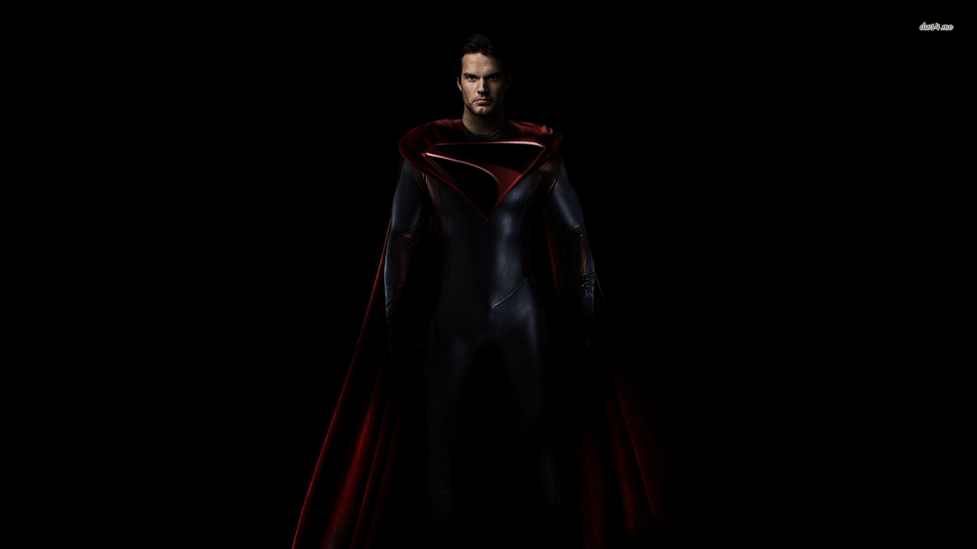 Description: A man in a red cape and black suit standing in the dark with his hands on his hips and his face slightly obscured by the cloak.