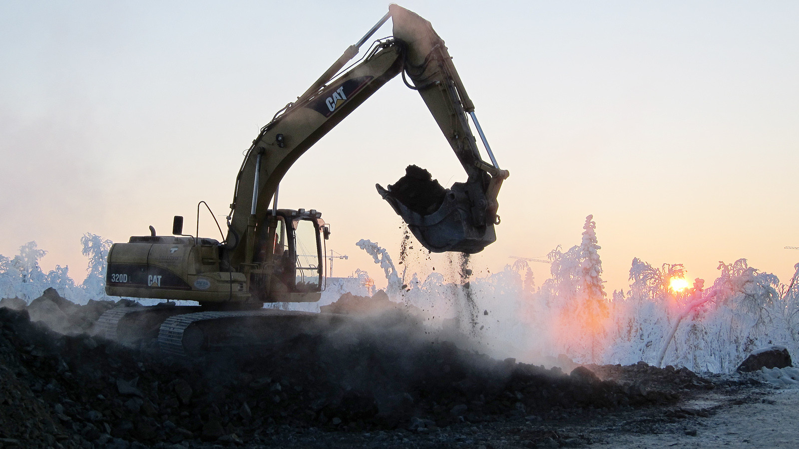 Description: A large excavator is dumping coal into a pile of dirt at sunset or dawn in the background.
