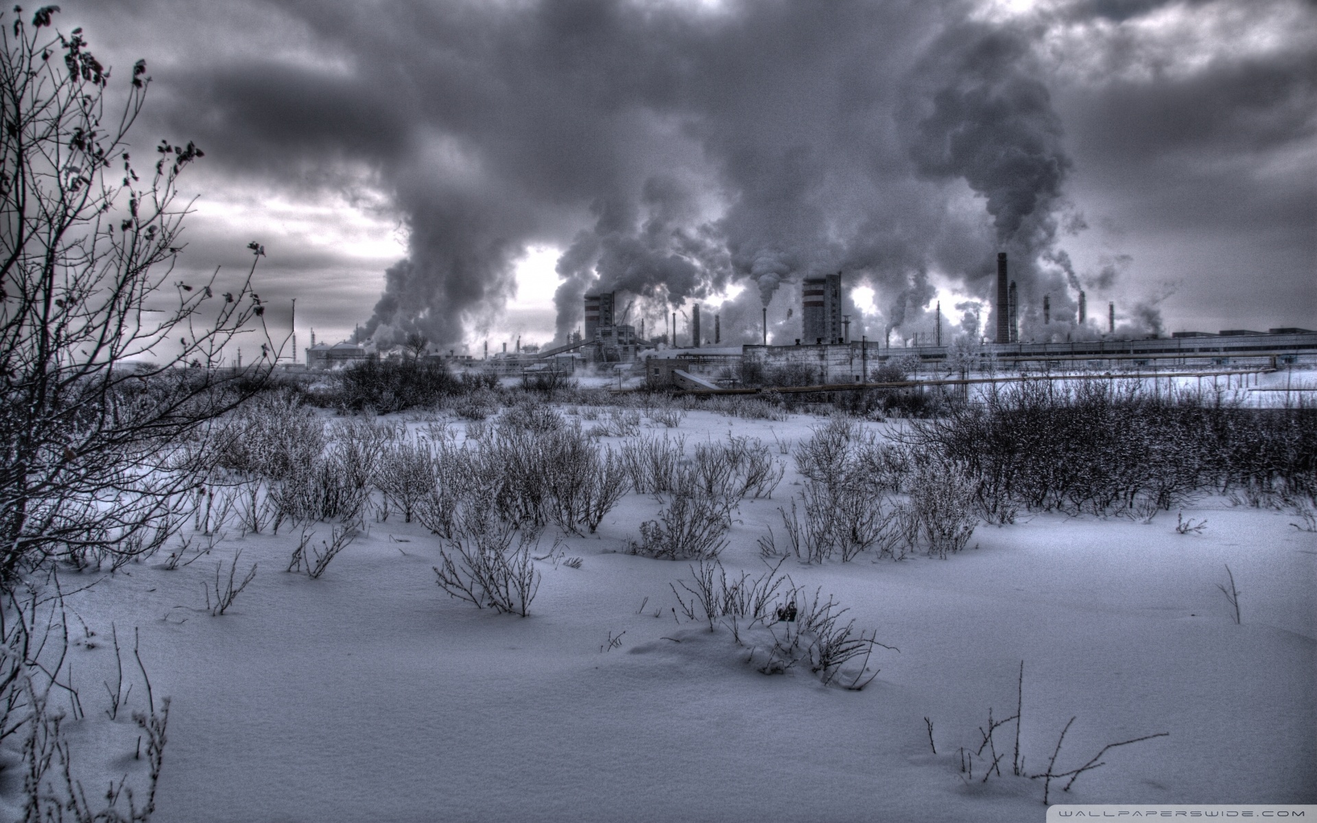 Description: A factory with smoke pouring out of it's stacks in the snow with trees in the foreground.