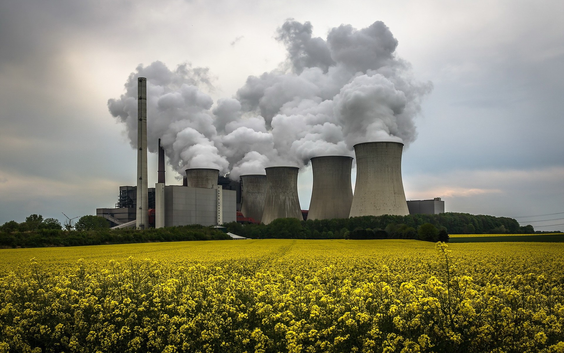 Description: A factory with smoke coming out of it's stacks and yellow flowers in the foreground and a field of yellow flowers in the foreground.