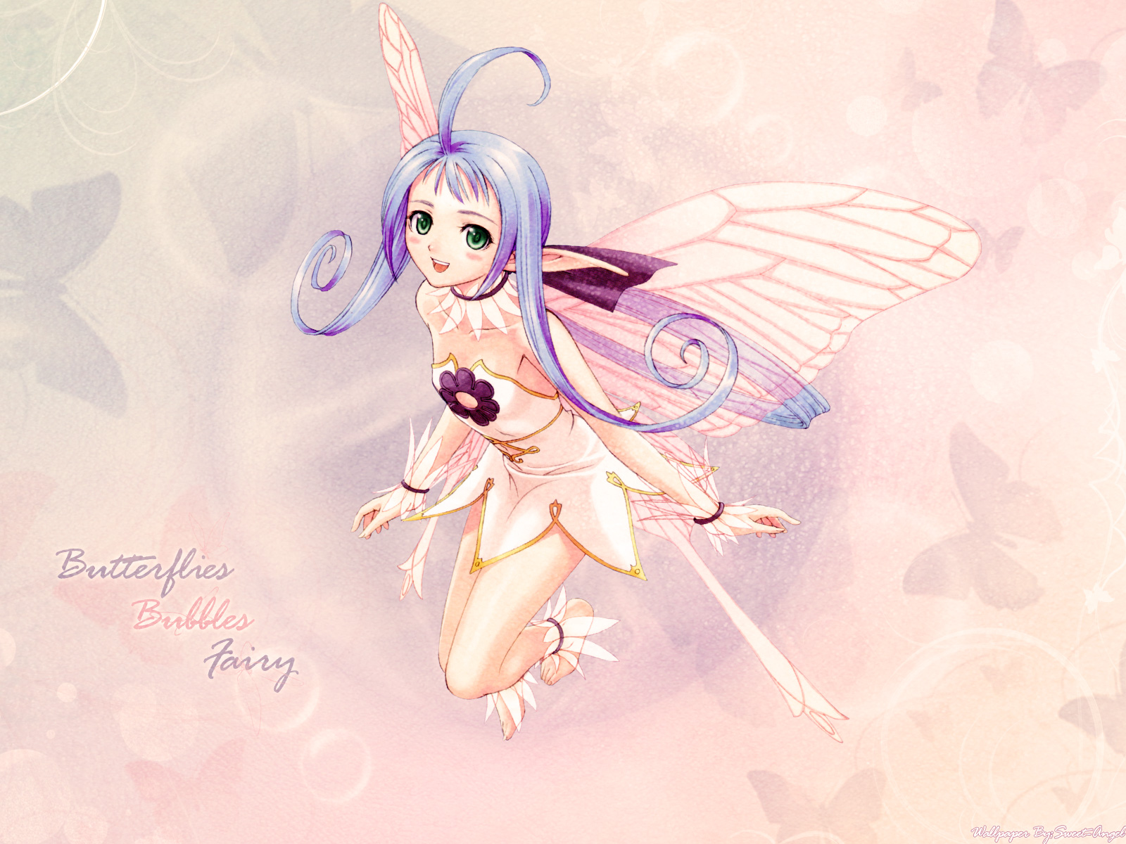 Description: A fairy with blue hair and a purple tail holding a wand and a flower in her hand.