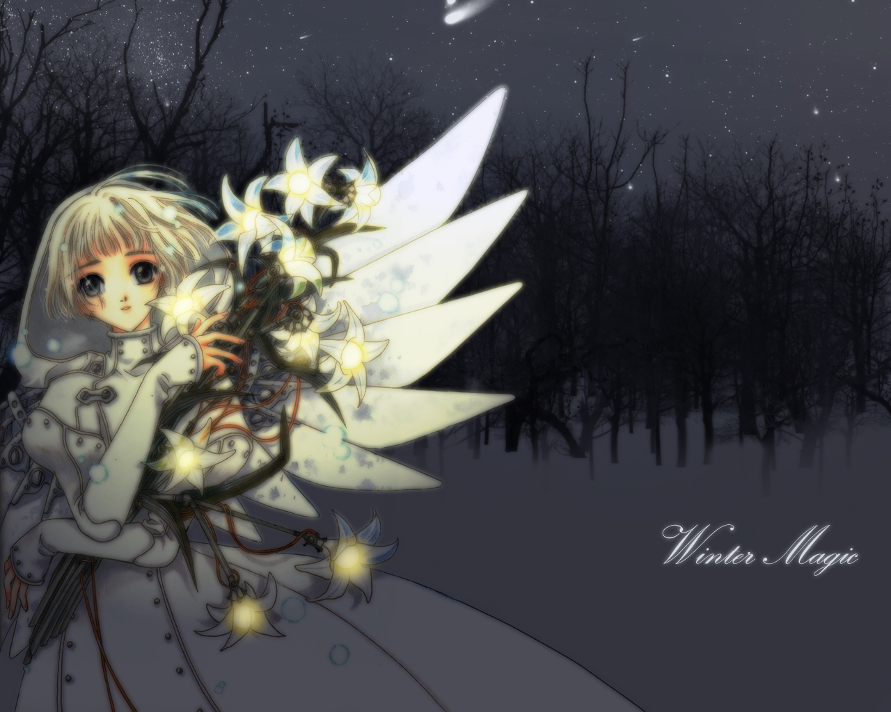 Description: A fairy holding a bouquet of flowers in the snow at night with stars in the sky above her and a moon in the background.