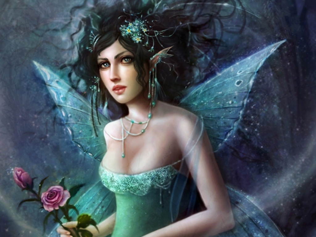 Description: A fairy with a rose in her hand and a butterfly on her shoulder.