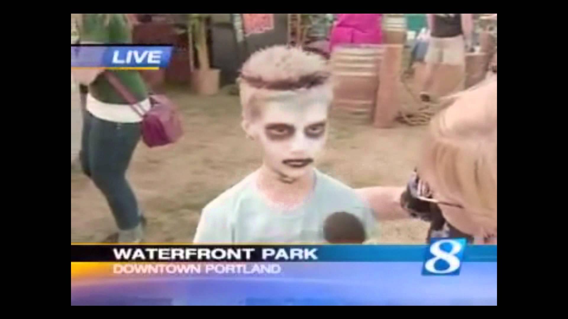 Description: A man with a fake face and a fake head on a news program with a reporter behind him and a woman with a fake face on the front.