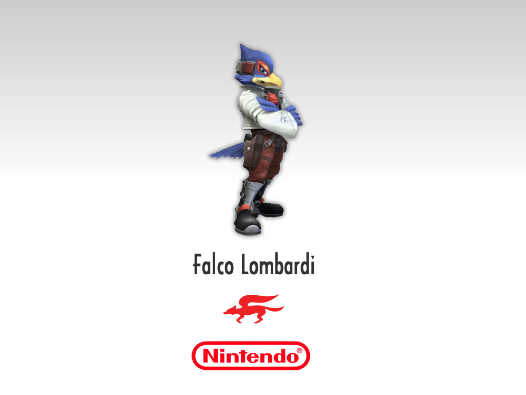 Description: A nintendo wii game character with a bird on his back and a red and white background with the words falco lombari.