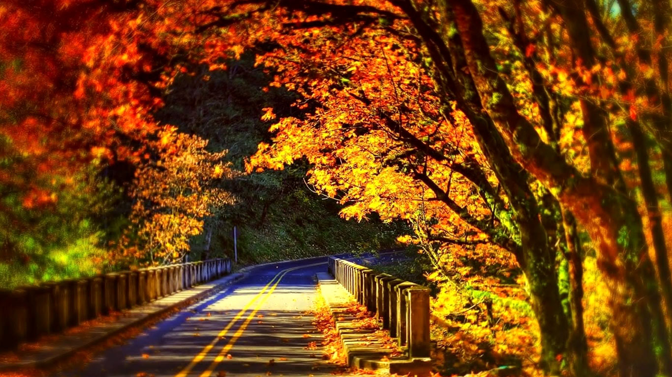 Description: A road with trees and a fence in the fall colors of the trees and the road is lined with yellow and orange leaves.
