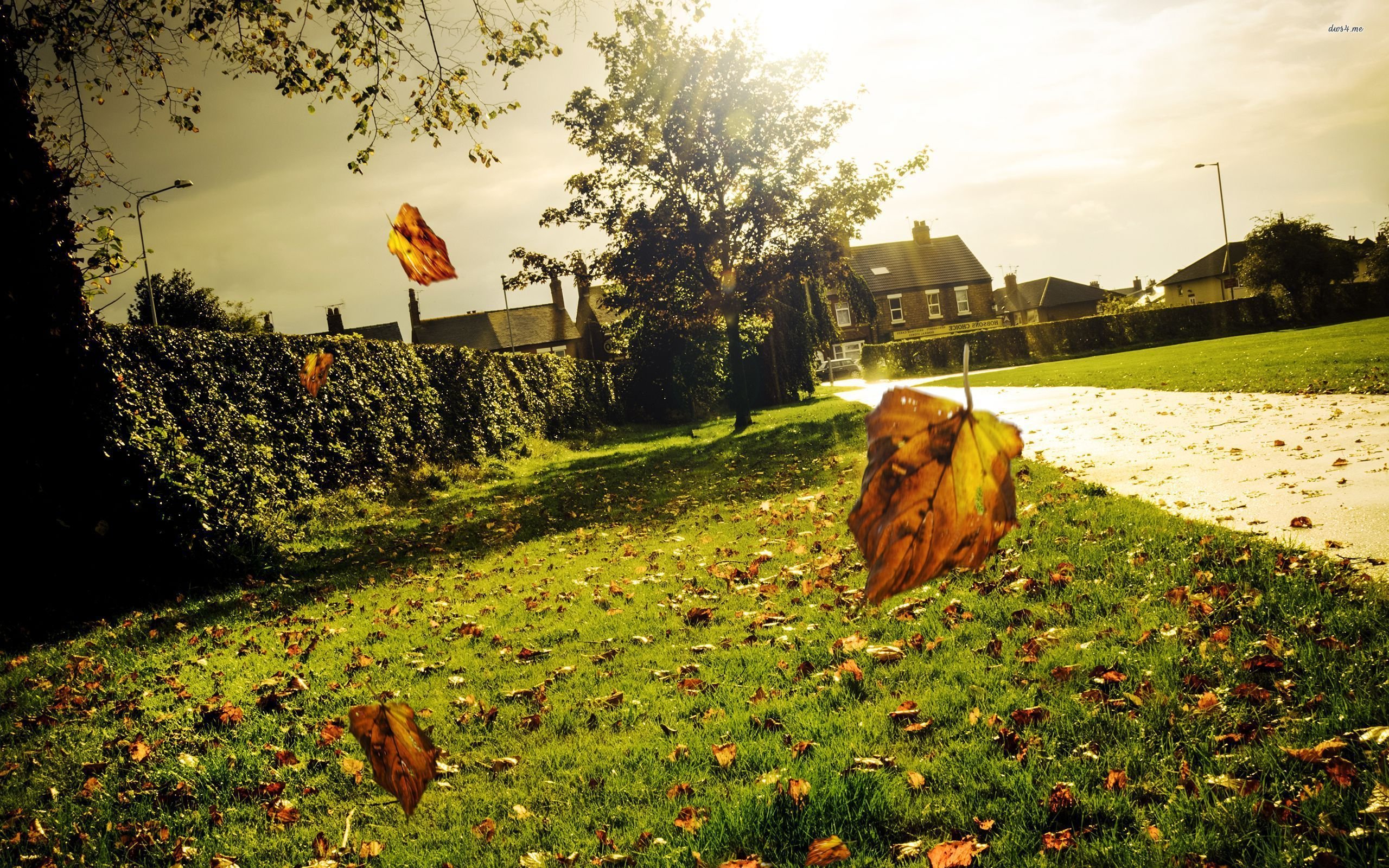 Description: A fallen tree in a grassy area with a house in the background and a yellow and red flag in the foreground.