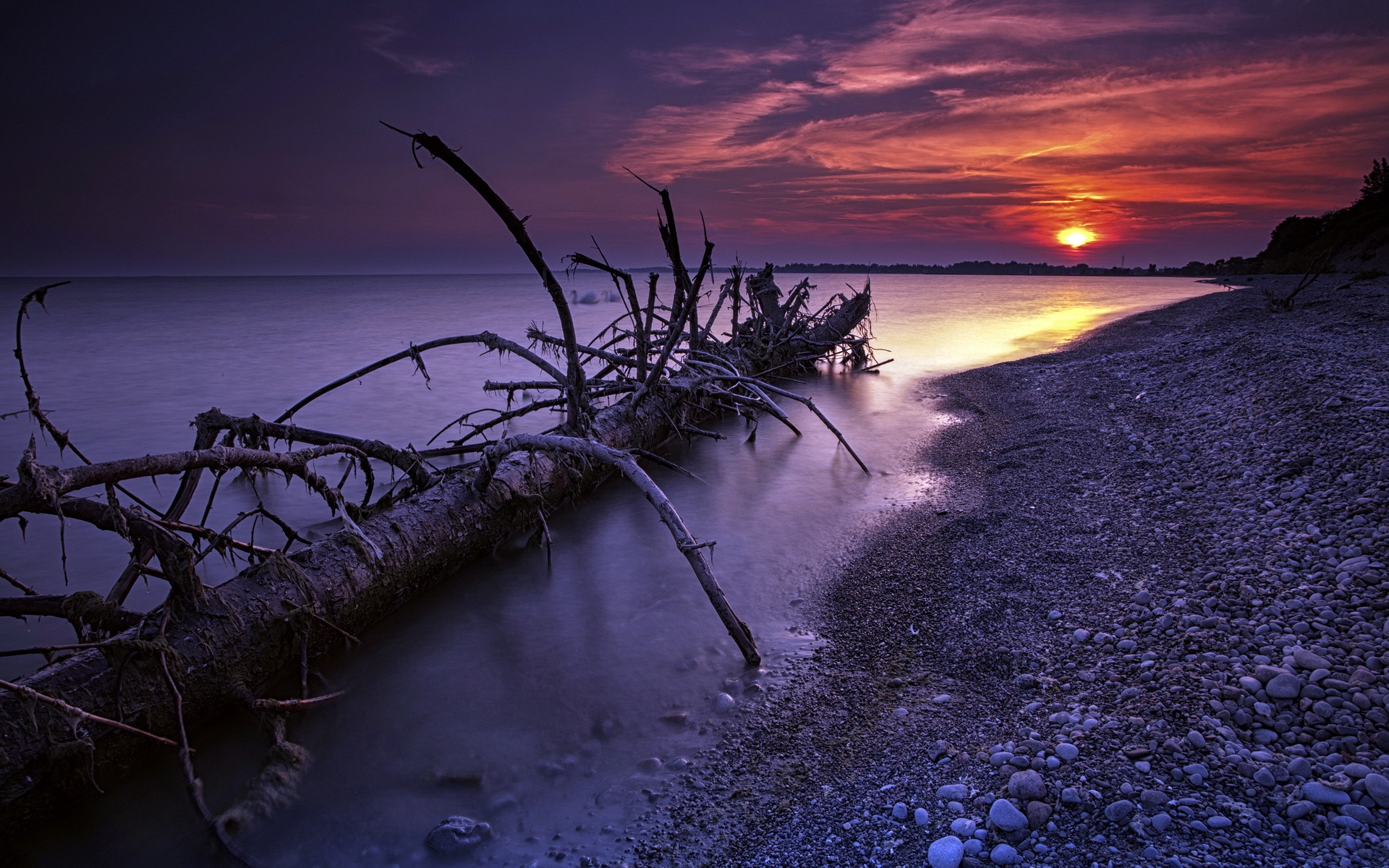 Description: A fallen tree laying on the shore of a lake at sunset with the sun setting in the distance behind it.