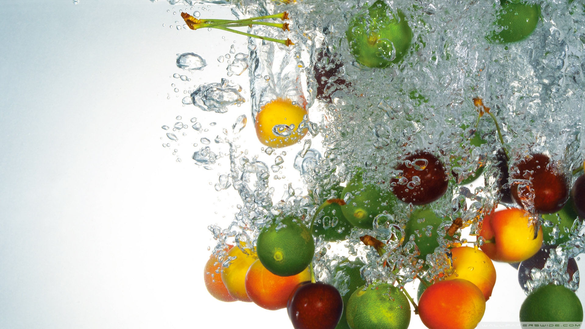 Description: A bunch of fruit is falling into the water with bubbles on it and a green apple in the middle.