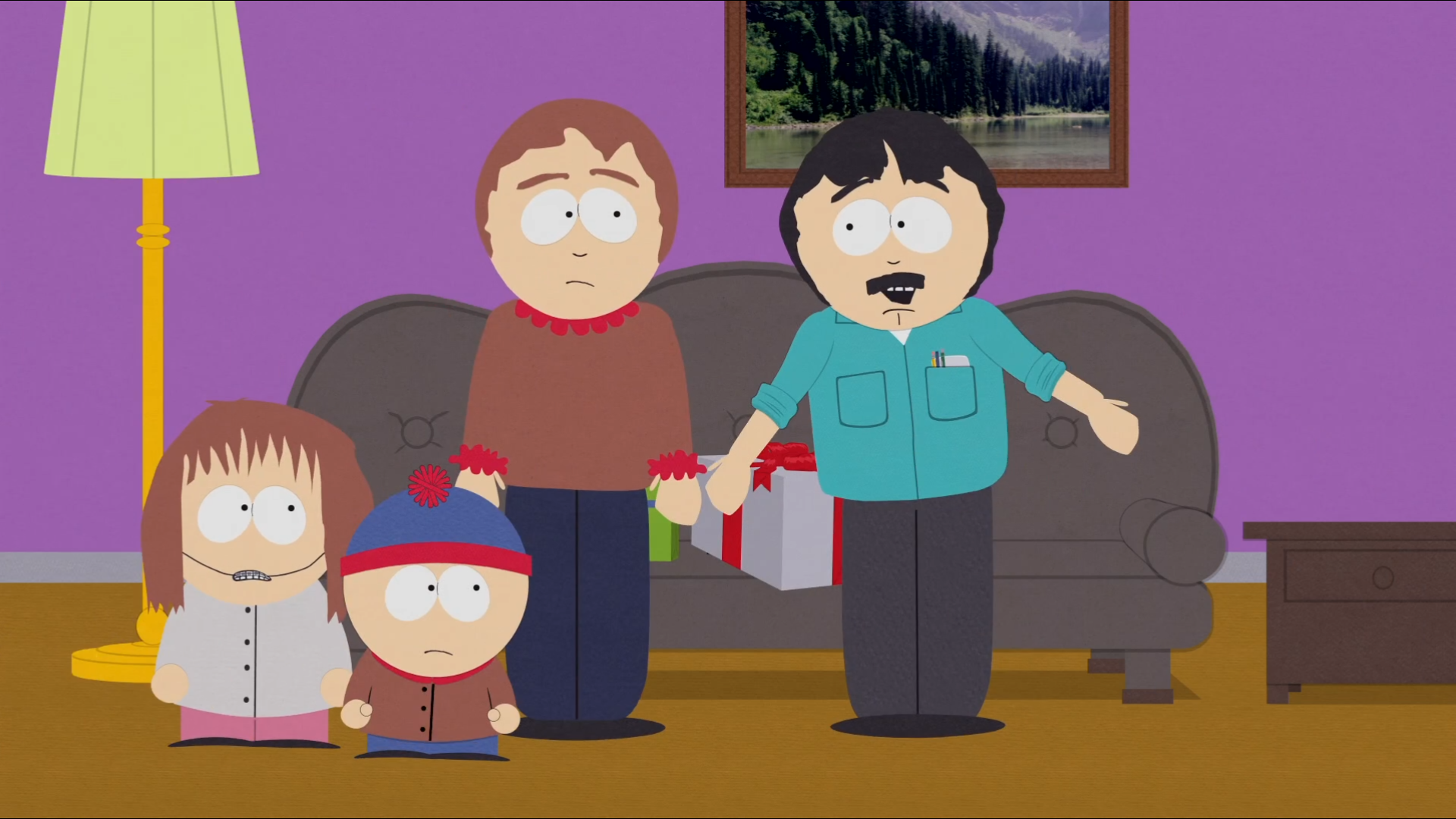 Description: A family standing in a living room with a christmas present in front of them and a christmas tree in the background.