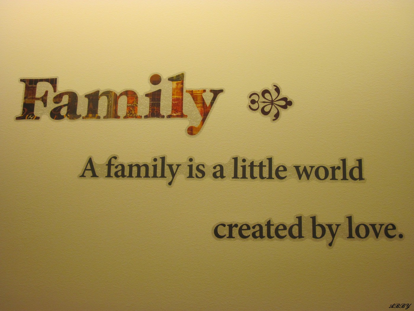 Description: A family is a little world created by love on a wall in a bathroom with a quote written on it.