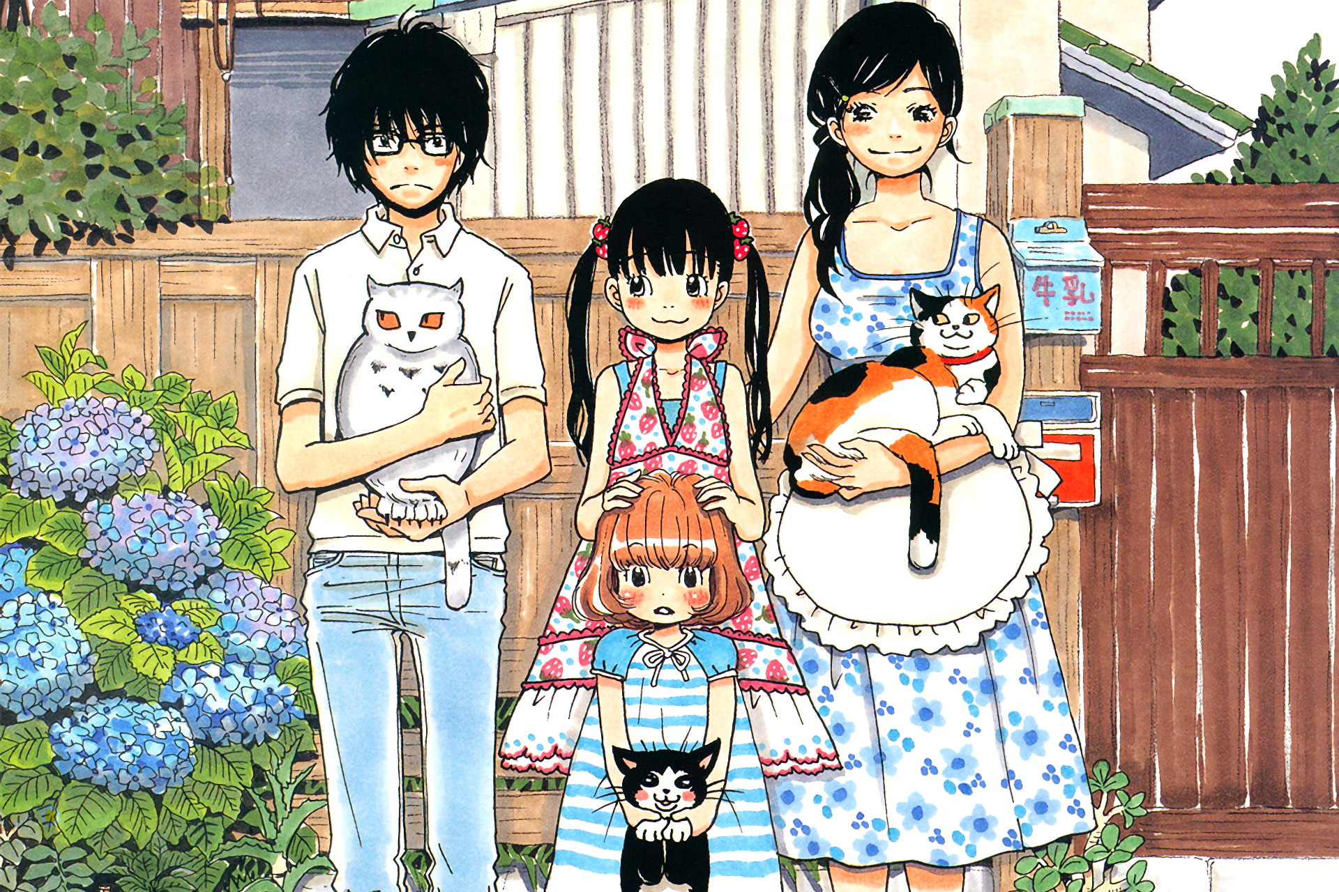 Description: A family of three standing next to each other in front of a house with a cat on their shoulders.