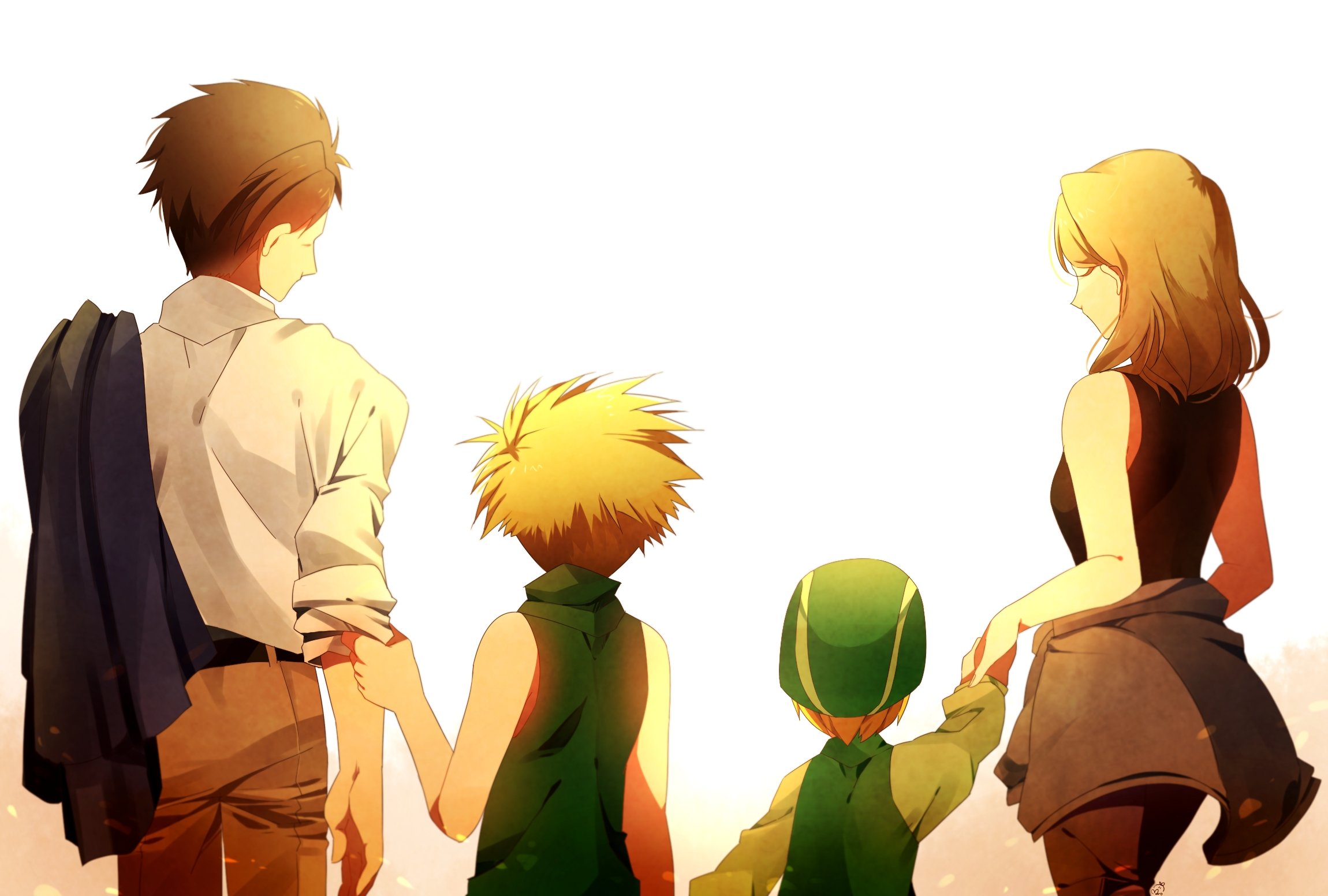 Description: A family of three standing next to each other in front of a white background with a sky in the background.