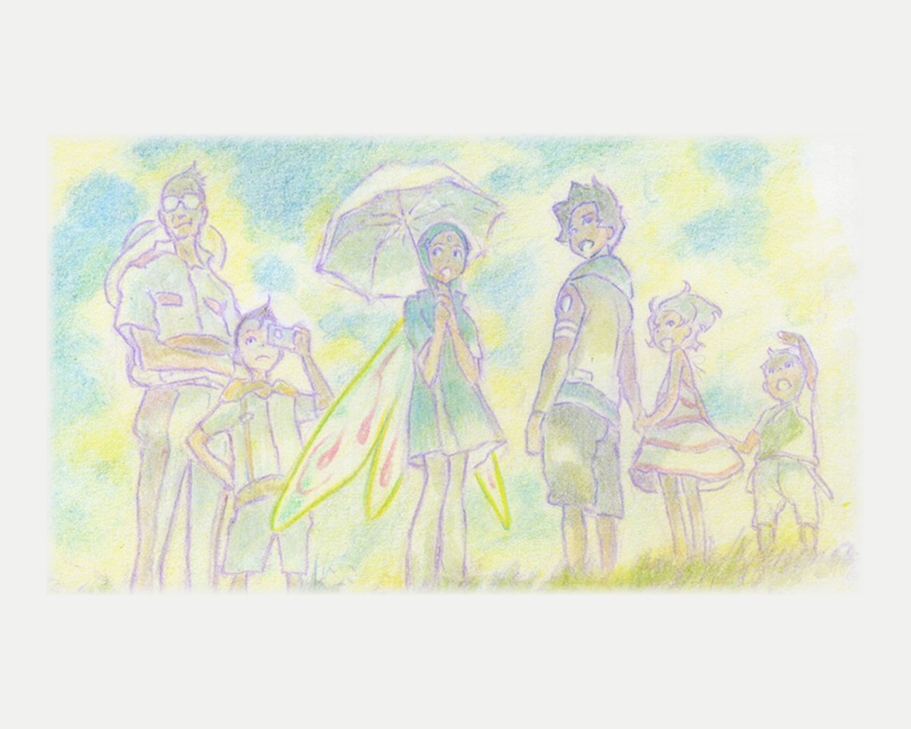 Description: A drawing of a family with a child and an adult holding an umbrella and a child holding a child.