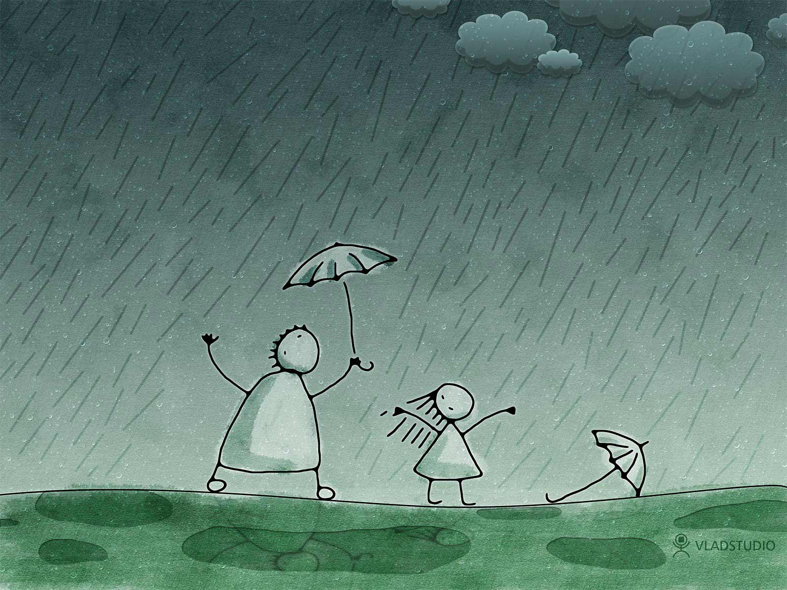 Description: A drawing of a family walking in the rain with an umbrella and a child holding an umbrella up to the sky.