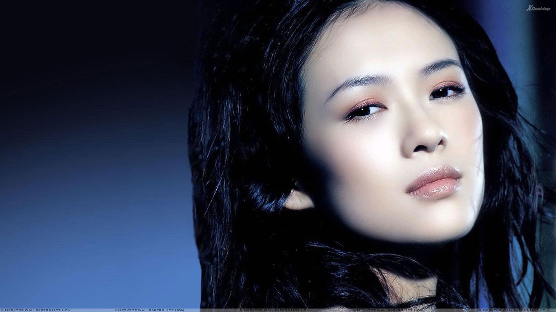 Description: A woman with long black hair and a blue background is posing for a picture with her hair in the wind.